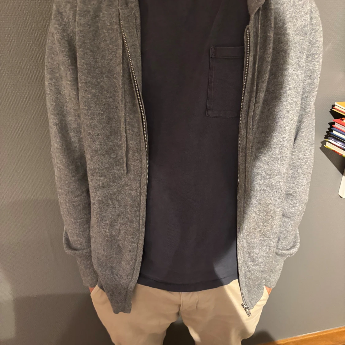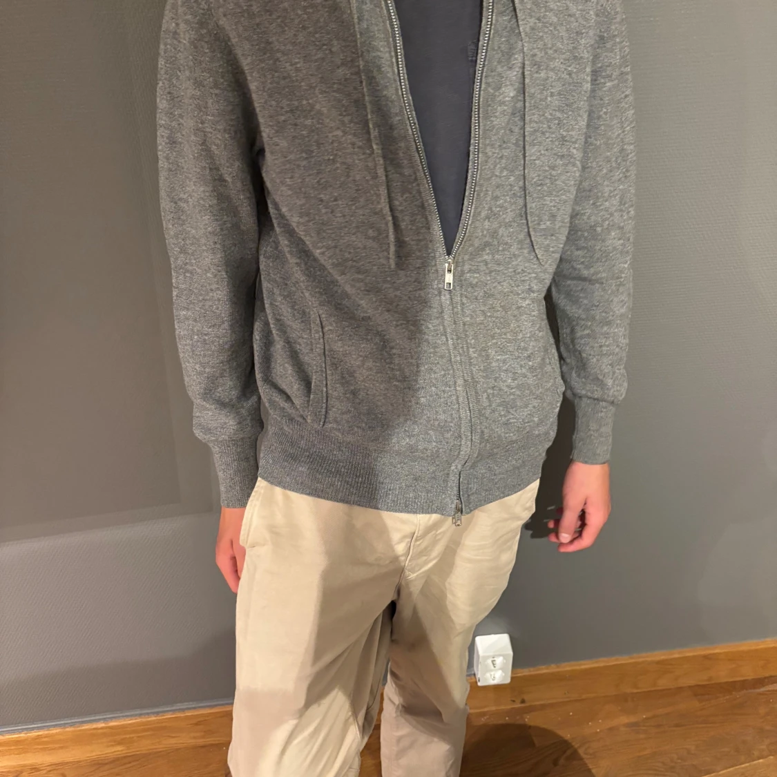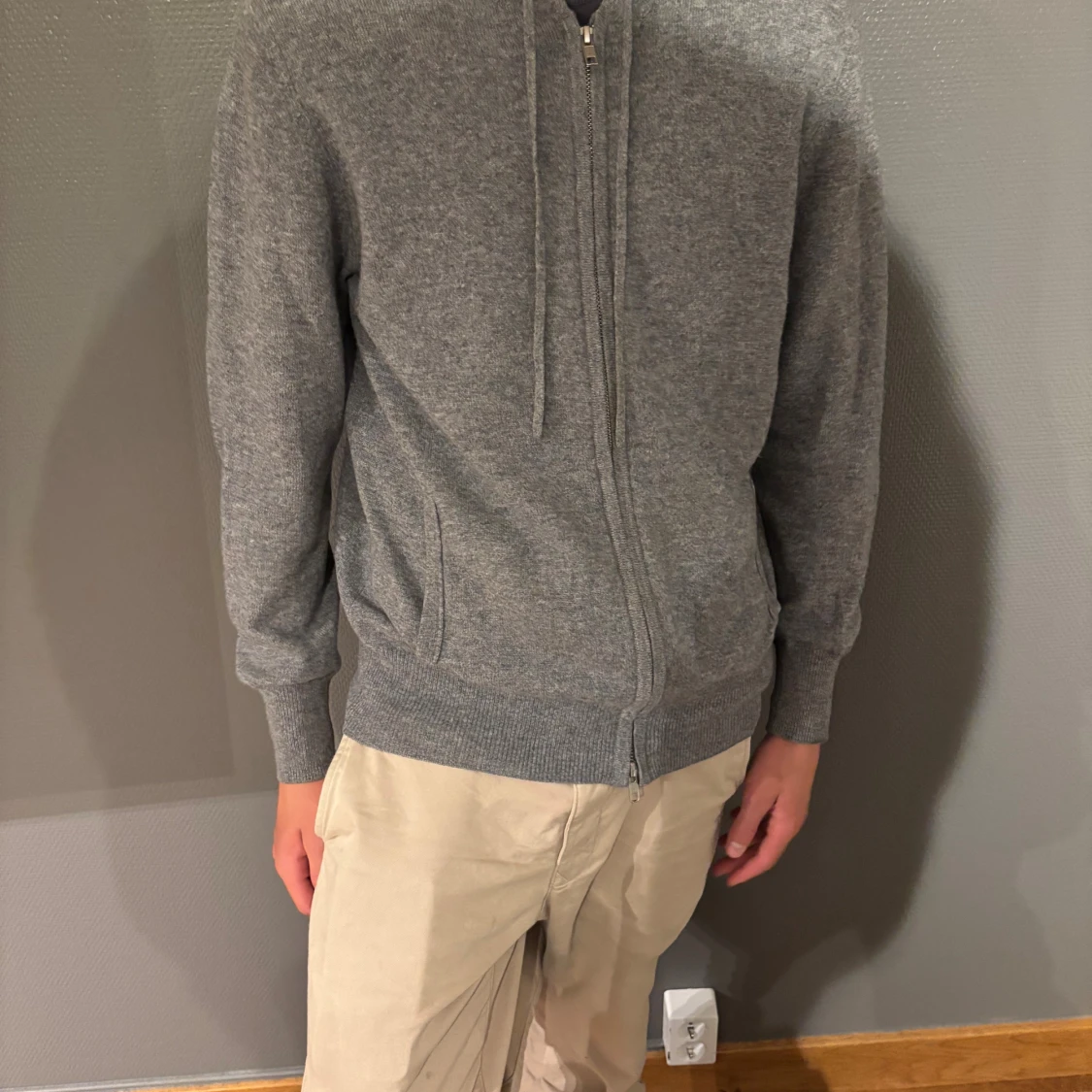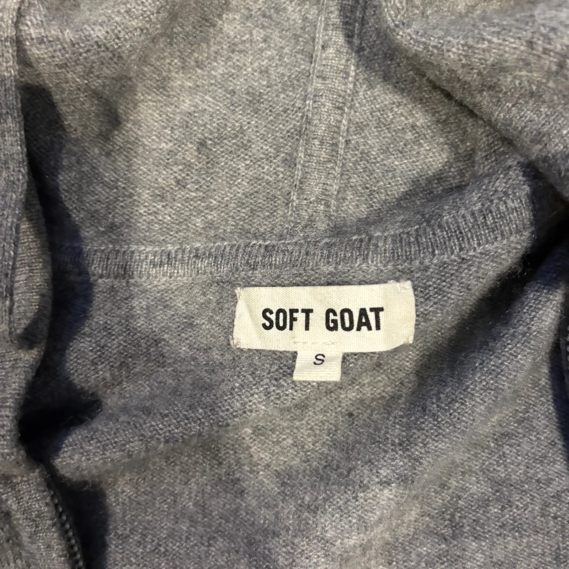Mjuk och stilren grå hoodie från Soft Goat i kashmir. Tröjan har dragkedja, huva med snörning och ribbade muddar. Perfekt för dig som gillar en clean look med premiumkänsla. Passformen är normal och den är långärmad. Tröjan har inga defekter och är i bra skick