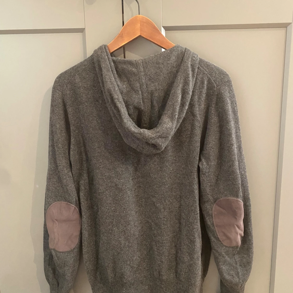 Snygg och skön grå hoodie från Soft Goat i mjuk kashmir. Tröjan är i storlek M. Har tidigare skada i ena armbågen och därför har en skräddare sytt på mocka lappar på armbågarna. Det gjorde tröjan bara snyggare!