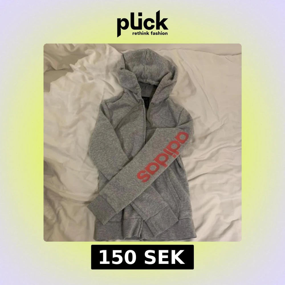 Säljer en grå kofta från Adidas med rosa logga på ärmen. Tröjan har en dragkedja framtill och en bekväm huva.