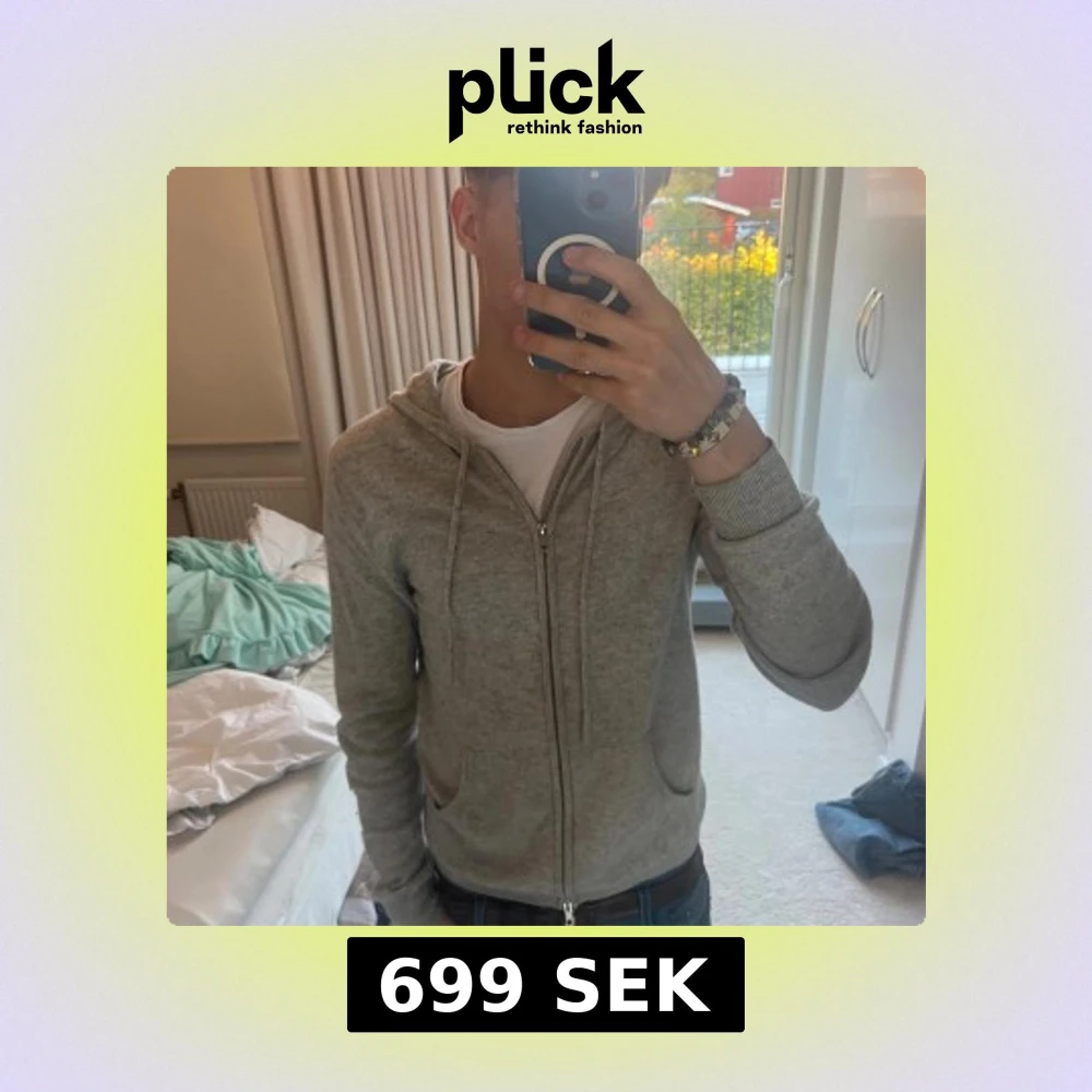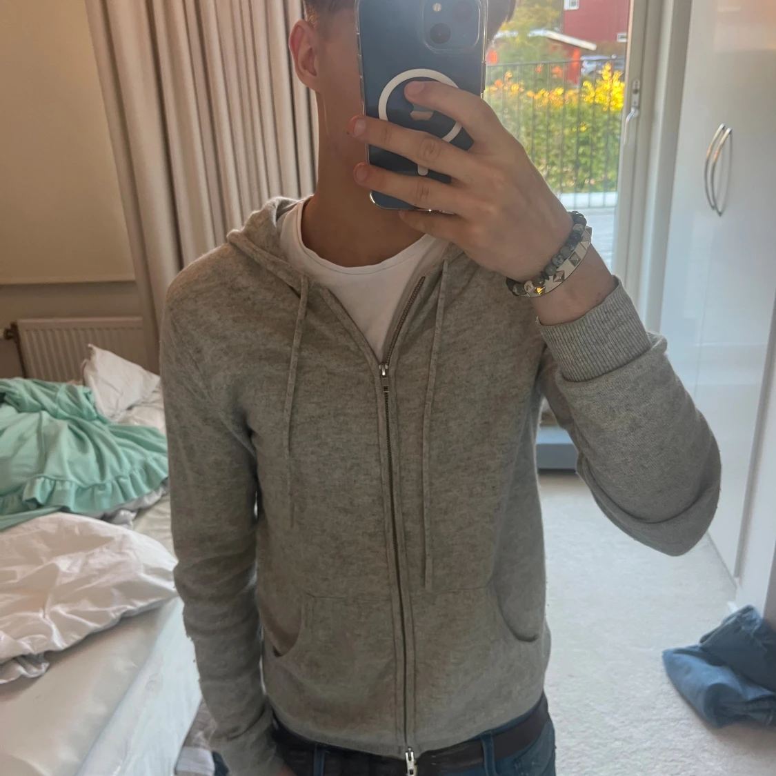 Säljer en stilren ljusgrå hoodie från John Henric med dragkedja framtill och huva. Tröjan har långa ärmar, ribbade muddar och två fickor framtill. Perfekt för chill dagar eller när du vill ha en enkel och clean look.