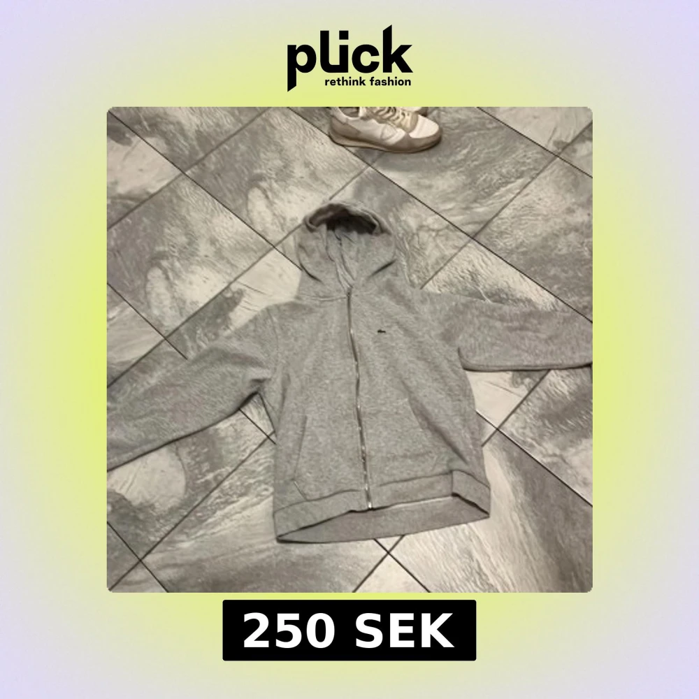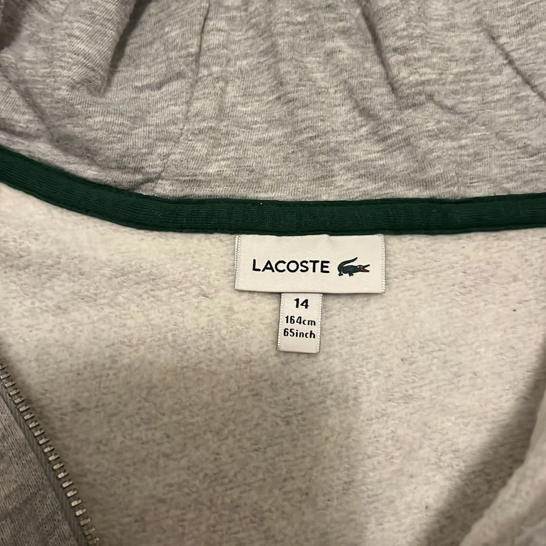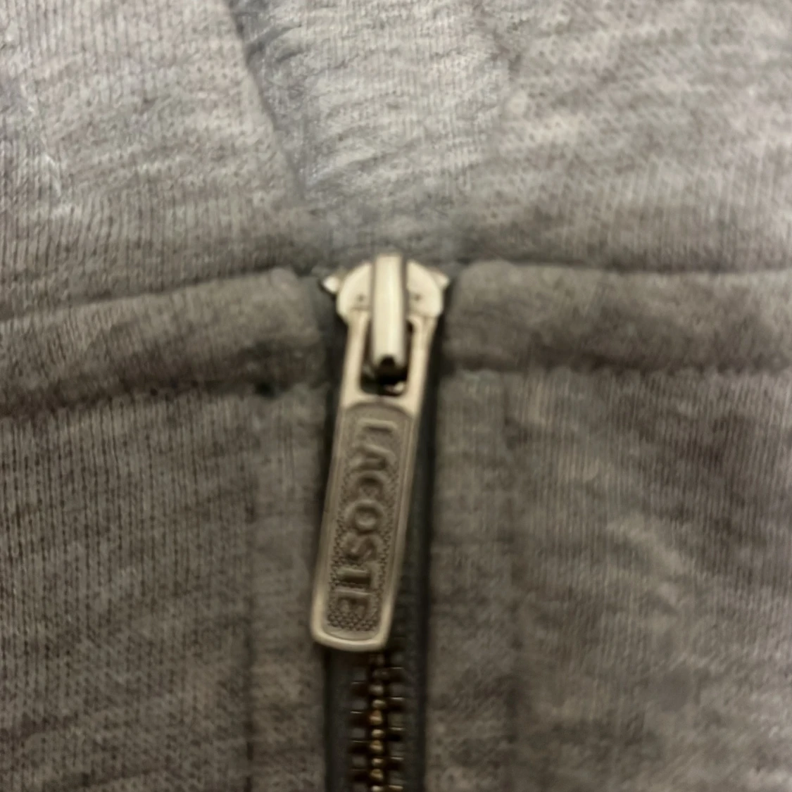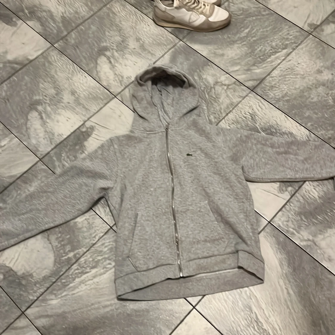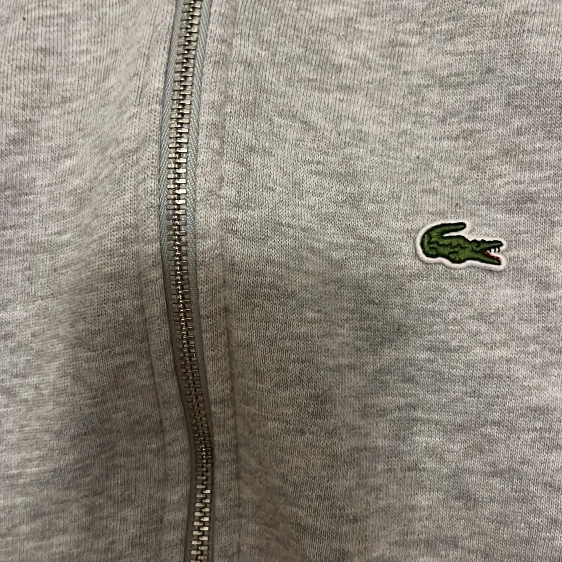 Säljer en stilren grå hoodie från Lacoste med dragkedja framtill och klassisk krokodillogga på bröstet. Tröjan har huva och ribbade muddar vid ärmslut och nederkant. Perfekt för en avslappnad look. Anledning varför jag säljer för liten!