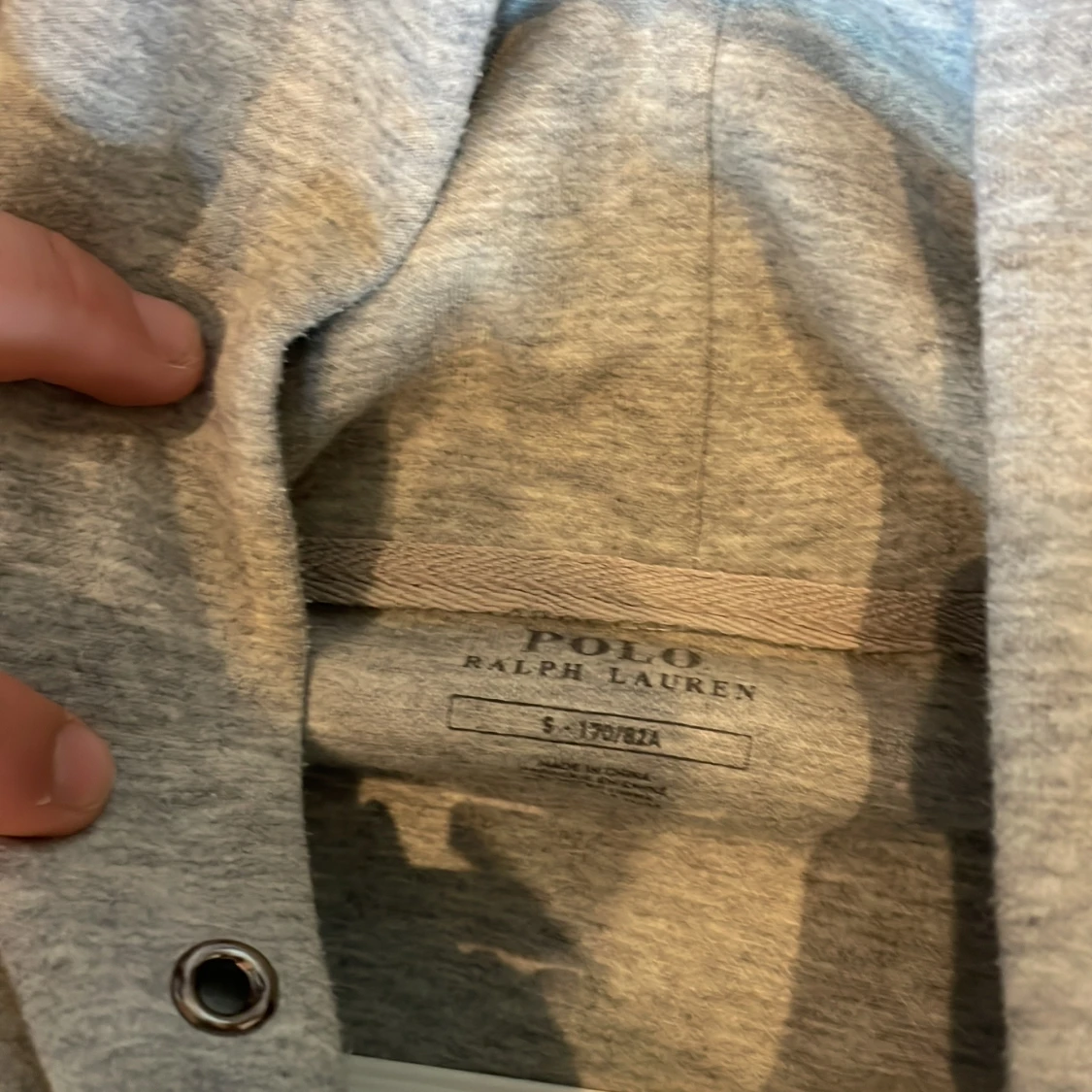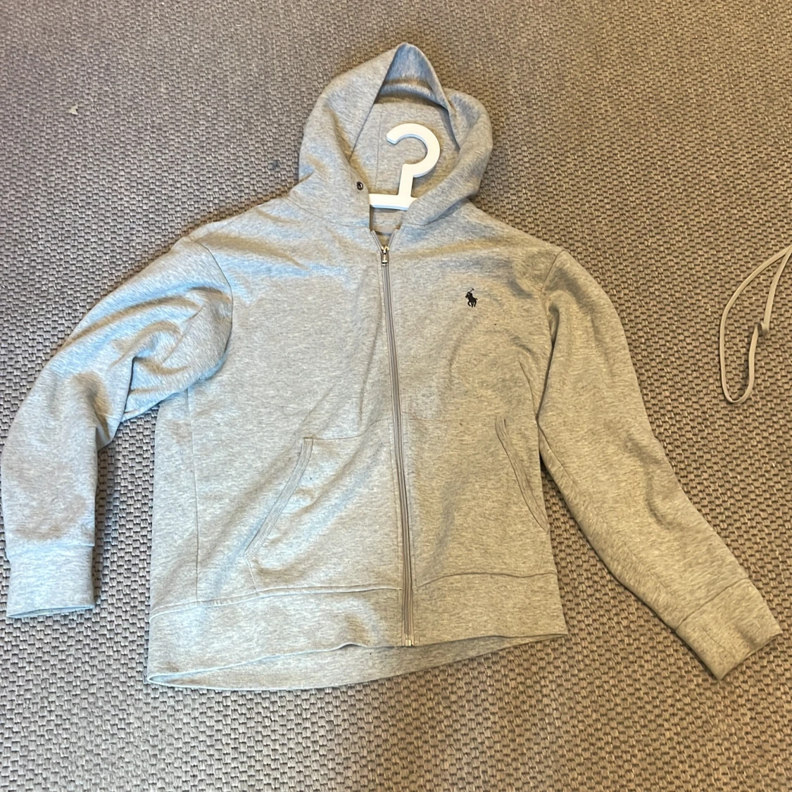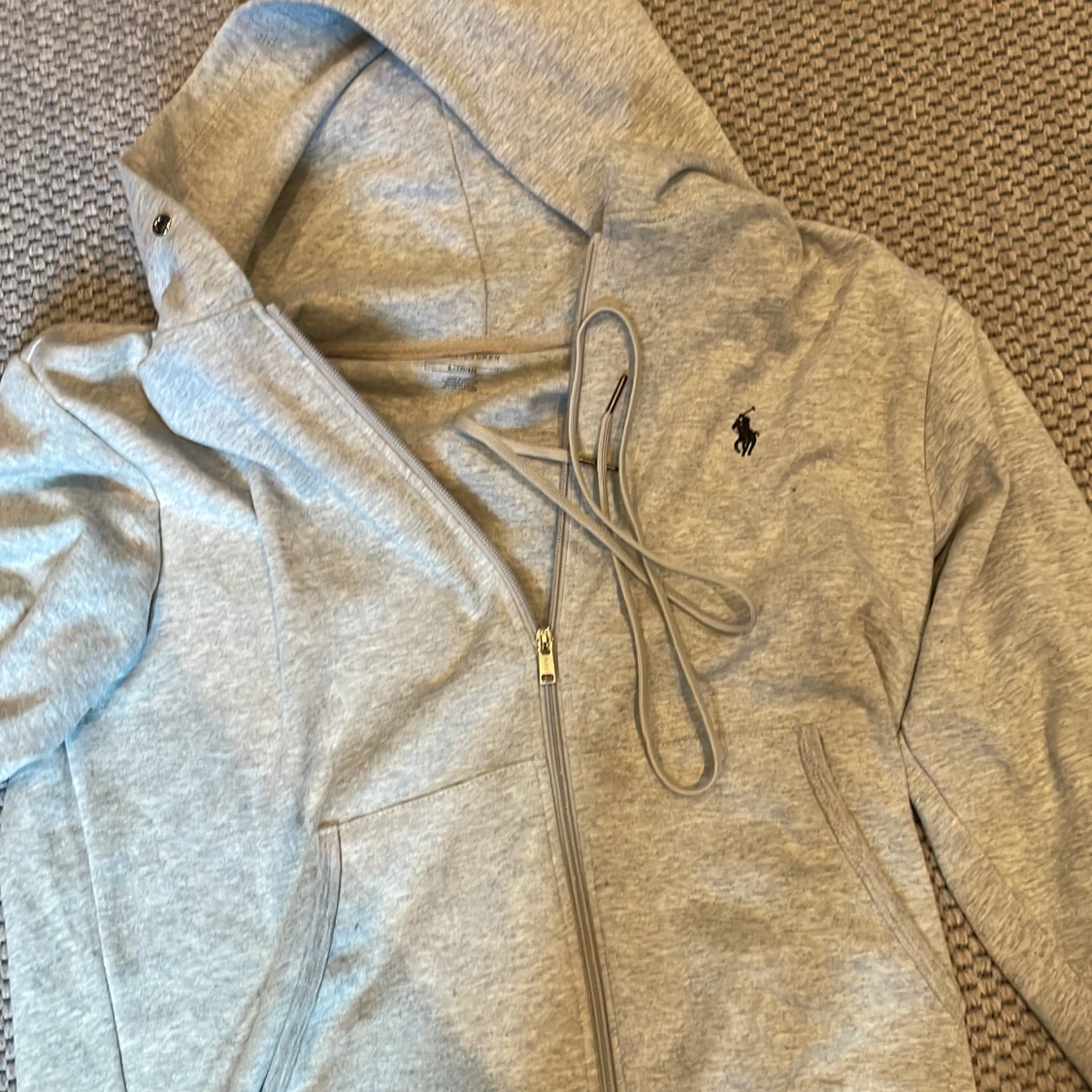 Säljer en klassisk grå hoodie från Polo Ralph Lauren med dragkedja framtill och huva med snörning. Tröjan har långa ärmar och en liten broderad logga på bröstet. Perfekt för en avslappnad stil.