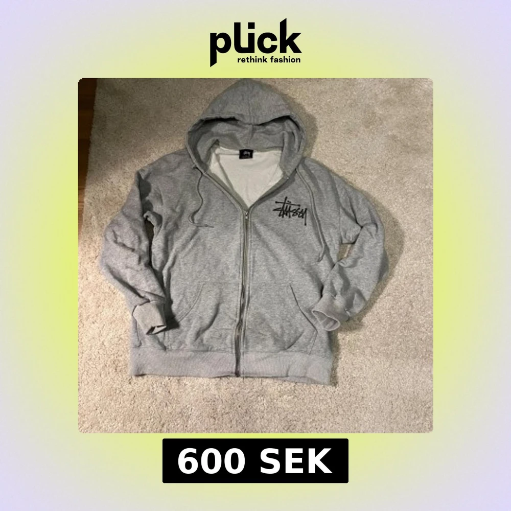 Säljer en grå hoodie från Stüssy i storlek S. Tröjan har dragkedja, huva och två fickor framtill. Stüssy-logga finns tryckt både på bröstet och stort på ryggen. Perfekt för en avslappnad streetwear-look.