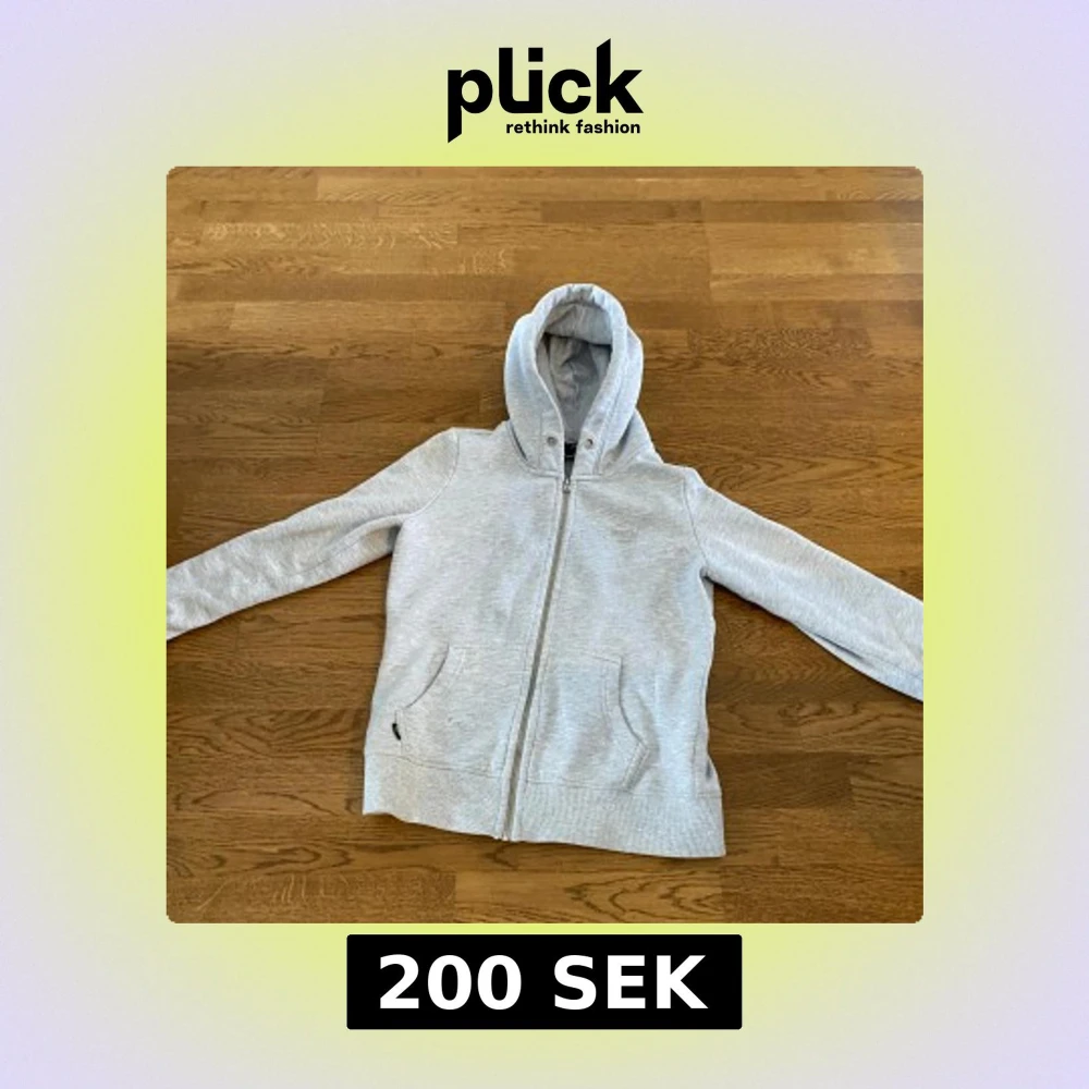 Säljer en stilren grå hoodie med dragkedja och huva. Tröjan har långa ärmar och praktiska fickor framtill. den har inte snören i men kan läggas till på egen hand.