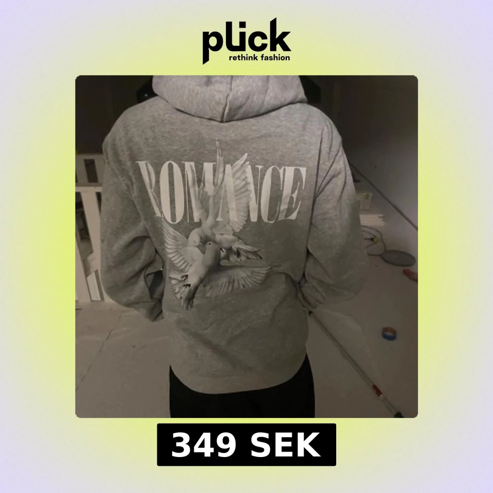 Snygg grå hoodie med tryck av två vita duvor och stor text 'ROMANCE' på ryggen. Framsidan har mindre text och klassisk magficka. Mjuk bomullsmix, huva med snörning och långa ärmar. Perfekt för chill dagar och streetstyle.