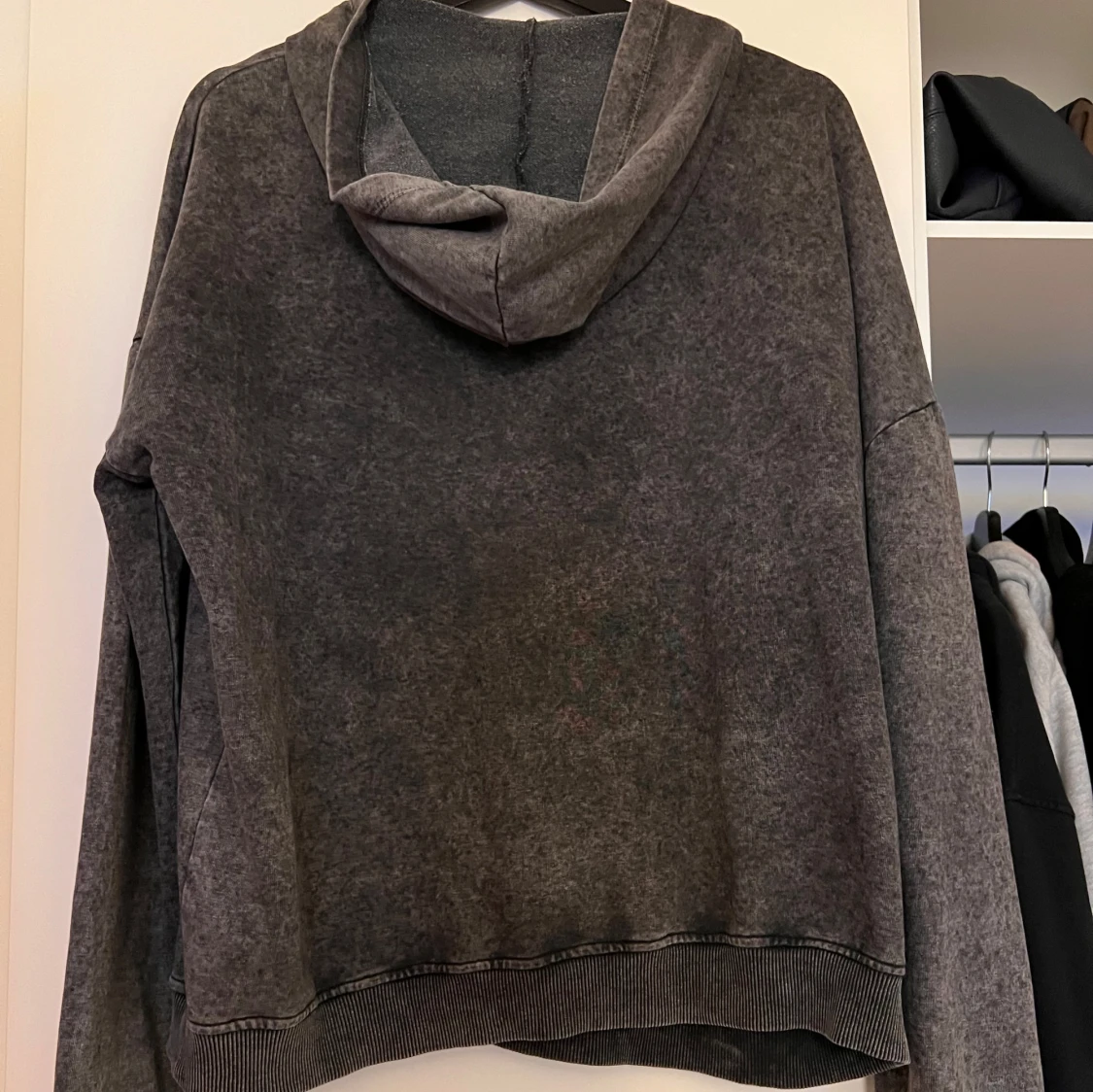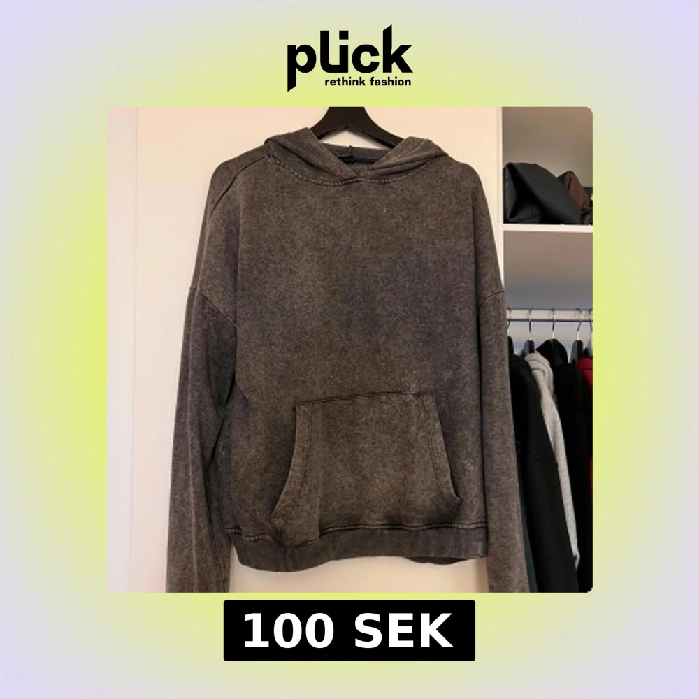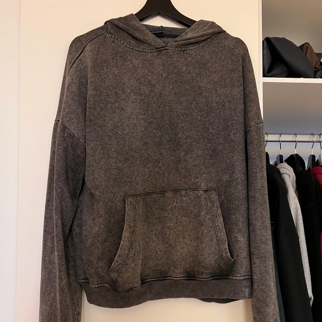 Säljer en grå hoodie med en stor ficka framtill. Tröjan har en avslappnad passform och är perfekt för kyligare dagar. Den har långa ärmar och en bekväm huva.