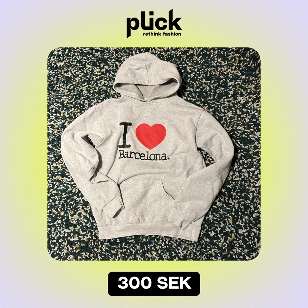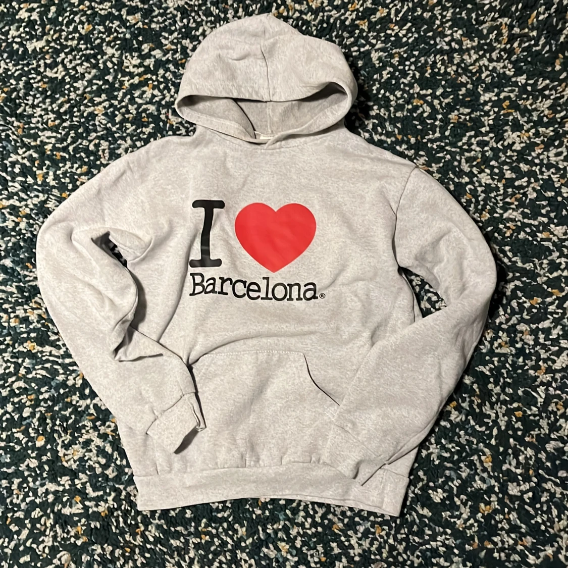 Säljer en grå hoodie med ett coolt 'I ❤️ Barcelona'-tryck. Den är i storlek S. Perfekt för en avslappnad stil och att visa kärlek till Barcelona! 🖤