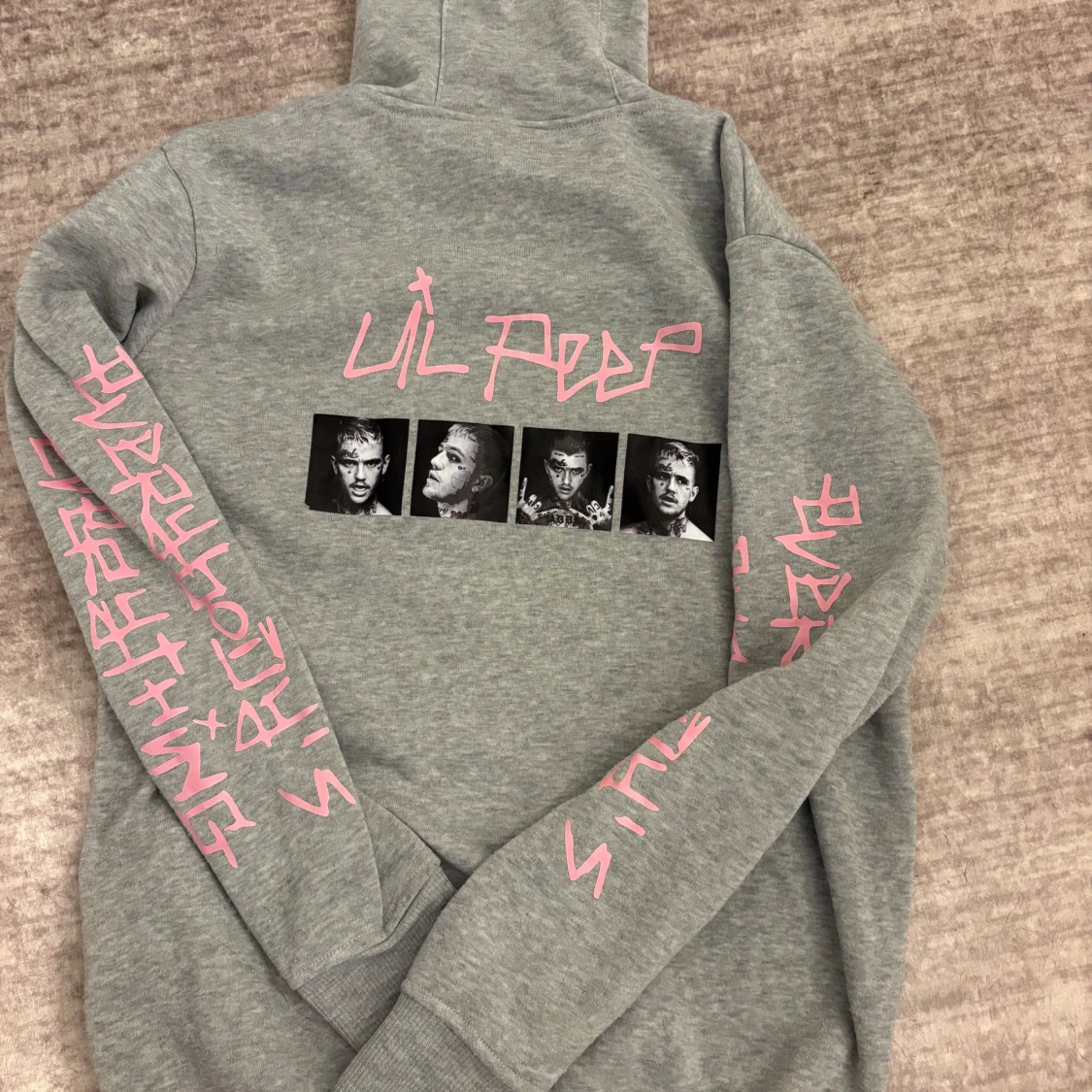 Grå hoodie med stor svartvit bild av Lil Peep på bröstet och rosa texten 'EVERYBODY'S EVERYTHING' på bröstet och ärmarna. På ryggen finns tre porträtt av Lil Peep och hans namn i rosa. Mjuk insida och klassisk huva.