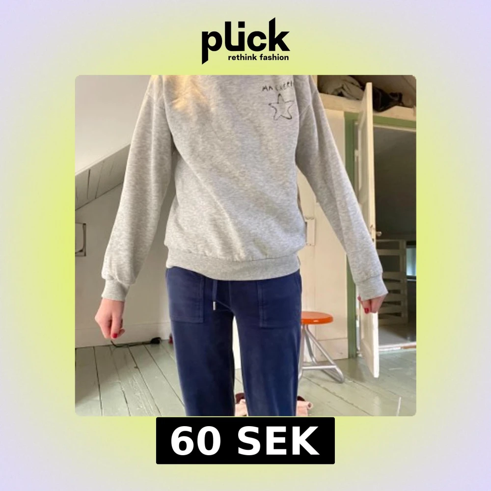 Säljer en grå hoodie med svart texten 'Ma Chérie' och en stjärna tryckt både fram och bak. Tröjan har huva, ribbade muddar och är långärmad. Den är från gina tricot i storlek 146-152 men stor i storlek. Materialet är mjuk bomull som känns skönt mot huden.