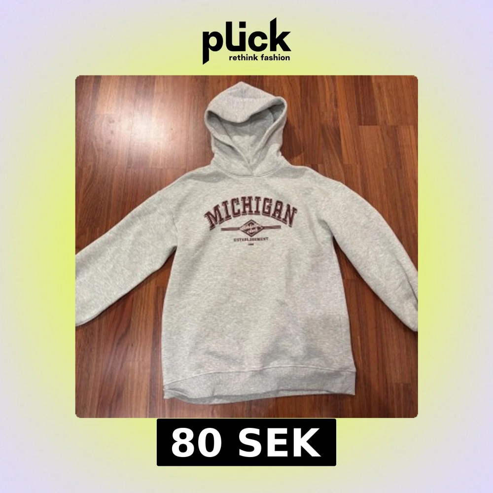 Säljer en grå hoodie med tryck av 'Michigan' i vinrött. Den har en klassisk design med huva och långa ärmar, perfekt för en avslappnad stil. Passar bra till både jeans och joggers. Lite längre i modellen