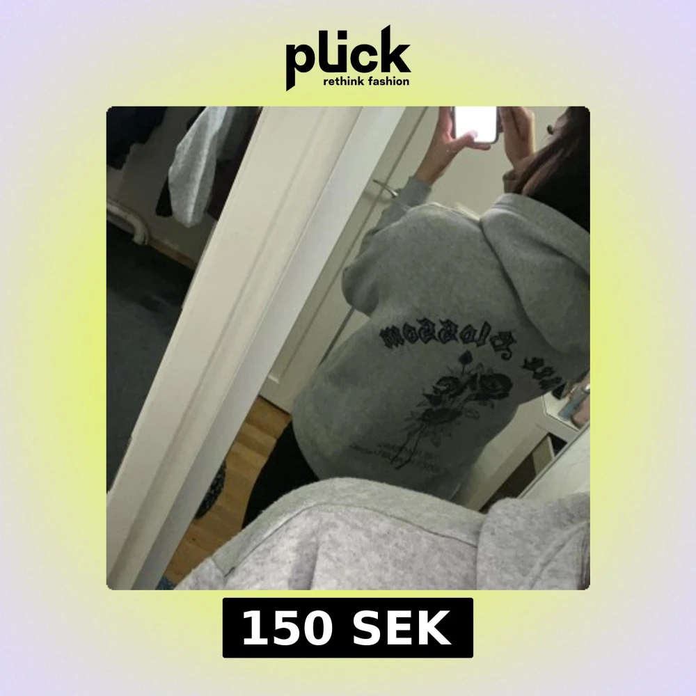 Säljer en grå hoodie med svart tryck av rosor och texten 'Future Blossom' på ryggen. Tröjan har huva, magficka och lång ärm. Perfekt för dig som gillar streetstyle och vill ha något bekvämt men ändå snyggt.