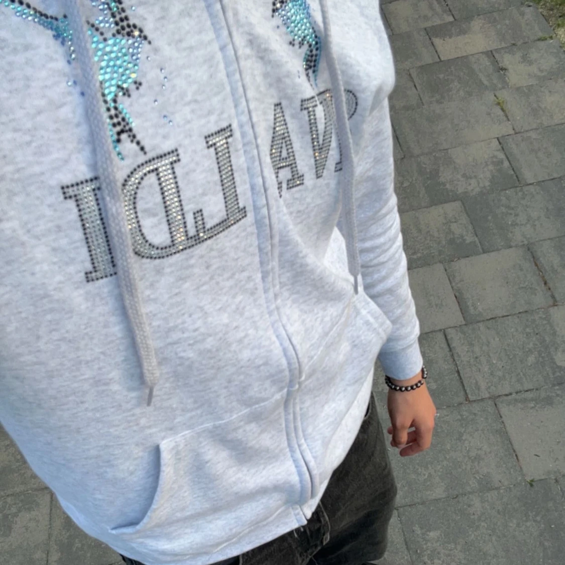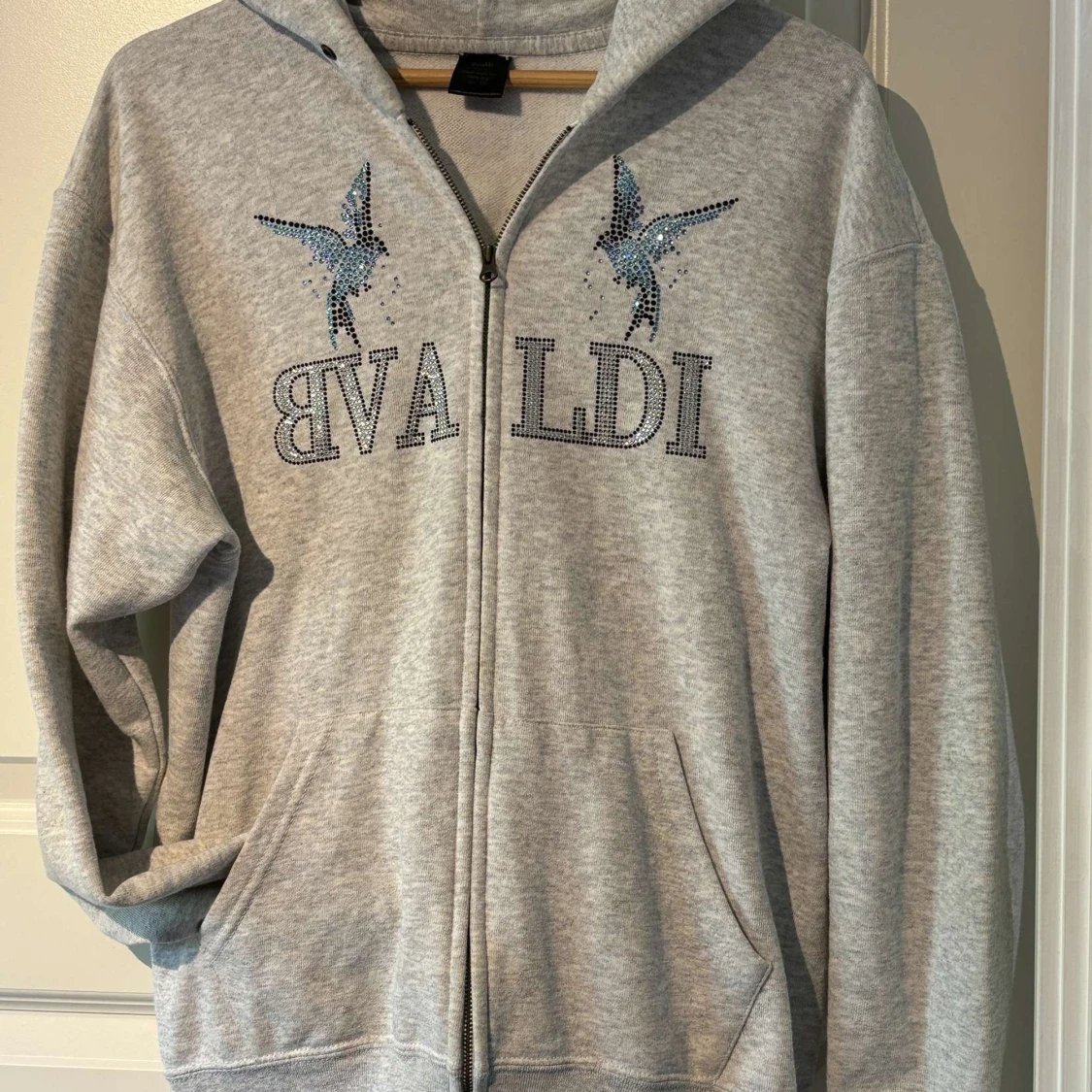 Grå hoodie med dragkedja och huva från Bvaldi. Mjuk insida och fickor framtill. Storlek M.