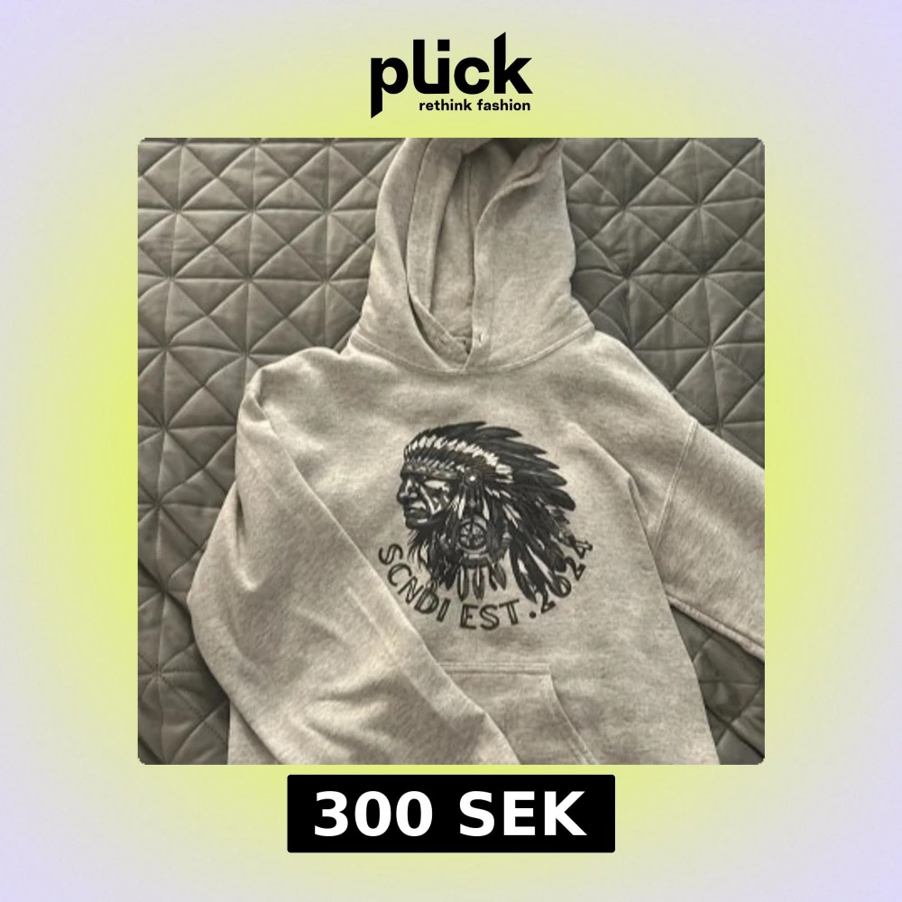 Säljer en grå hoodie från Gildan med stort svart tryck framtill som föreställer ett huvudbonadsmotiv och texten 'SCNDI EST. 2024'. Hoodien har huva och känguruficka, perfekt för chill dagar. Materialet är en mjuk bomullsblandning.