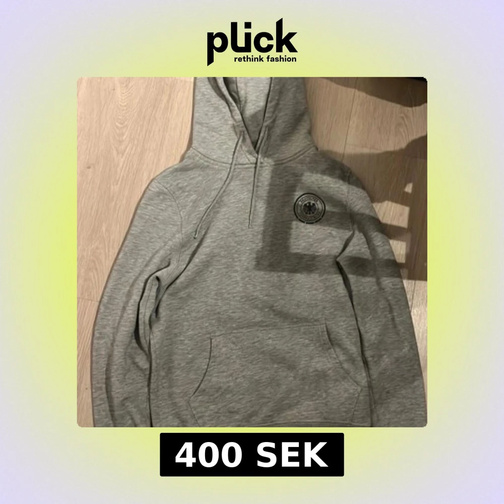 Säljer en grå hoodie med tryck från Tyskland. Den har en stor ficka framtill och ett tryck med texten 'Germany' och 'Deutscher Fussball Bund' på ryggen.