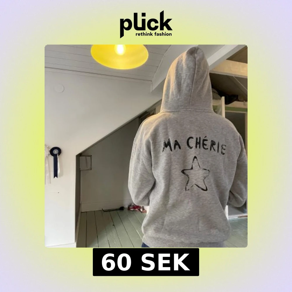 Säljer en ljusgrå hoodie med svart tryck 'MA CHÉRIE' och en stjärna på ryggen samt mindre tryck på bröstet. Tröjan har huva och är långärmad, tillverkad i mjuk bomullsmix. I storlek 146-152 från gina tricot fast lite stor i storlek.