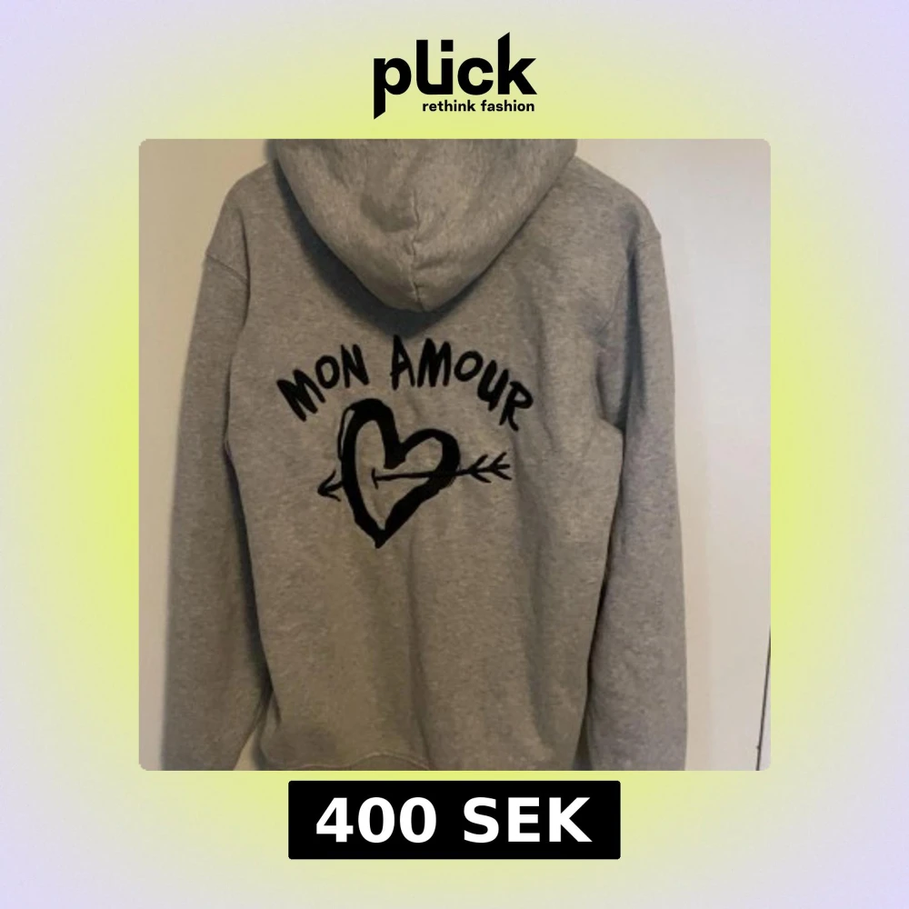 Säljer en grå hoodie med svart tryck på ryggen där det står 'Mon Amour' och ett hjärta med pil. Passar Large och medium. Är i bra skick! Bara höra av sig om du har frågor eller funderingar :)
