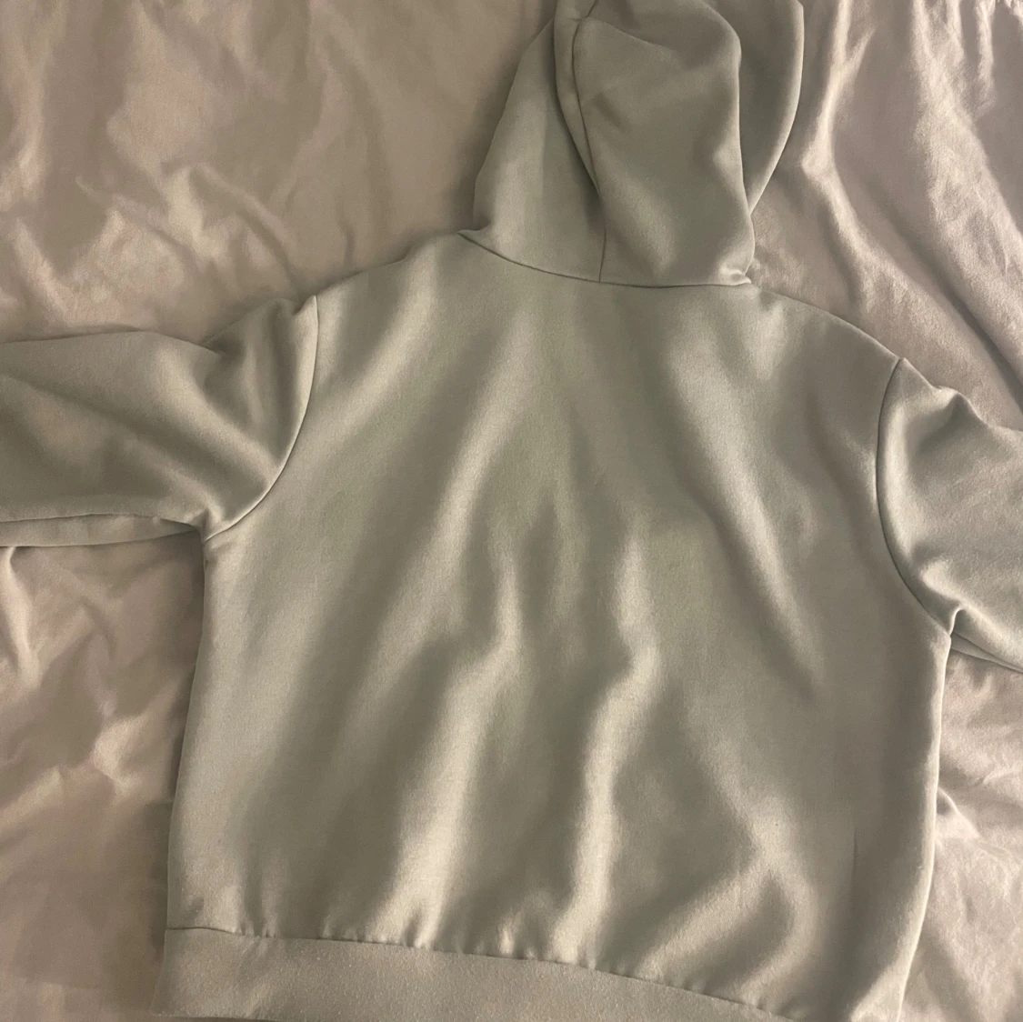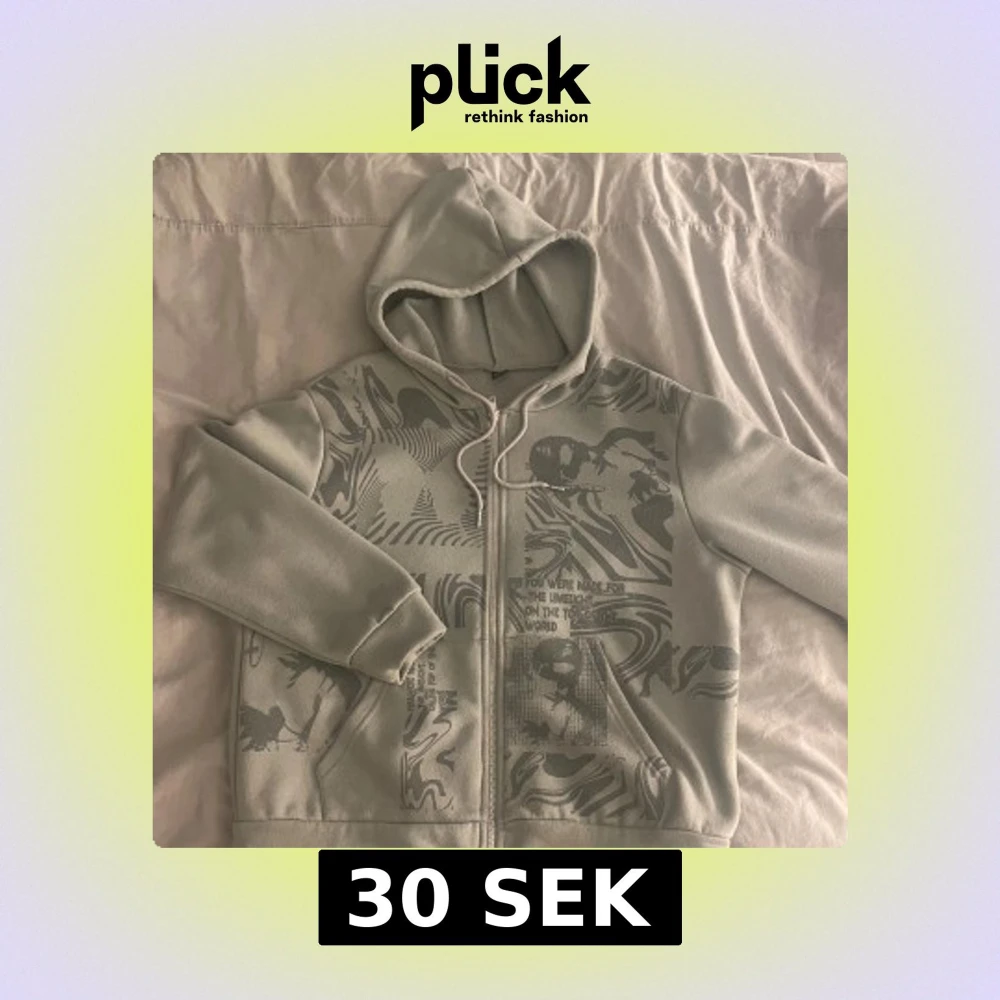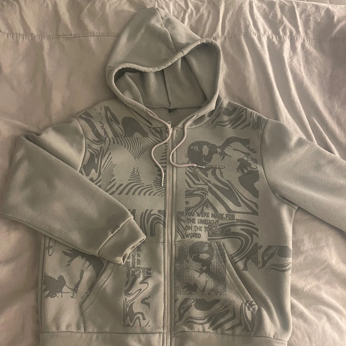 Säljer en grå hoodie med coolt grafiskt tryck framtill med dragkedja.🩶