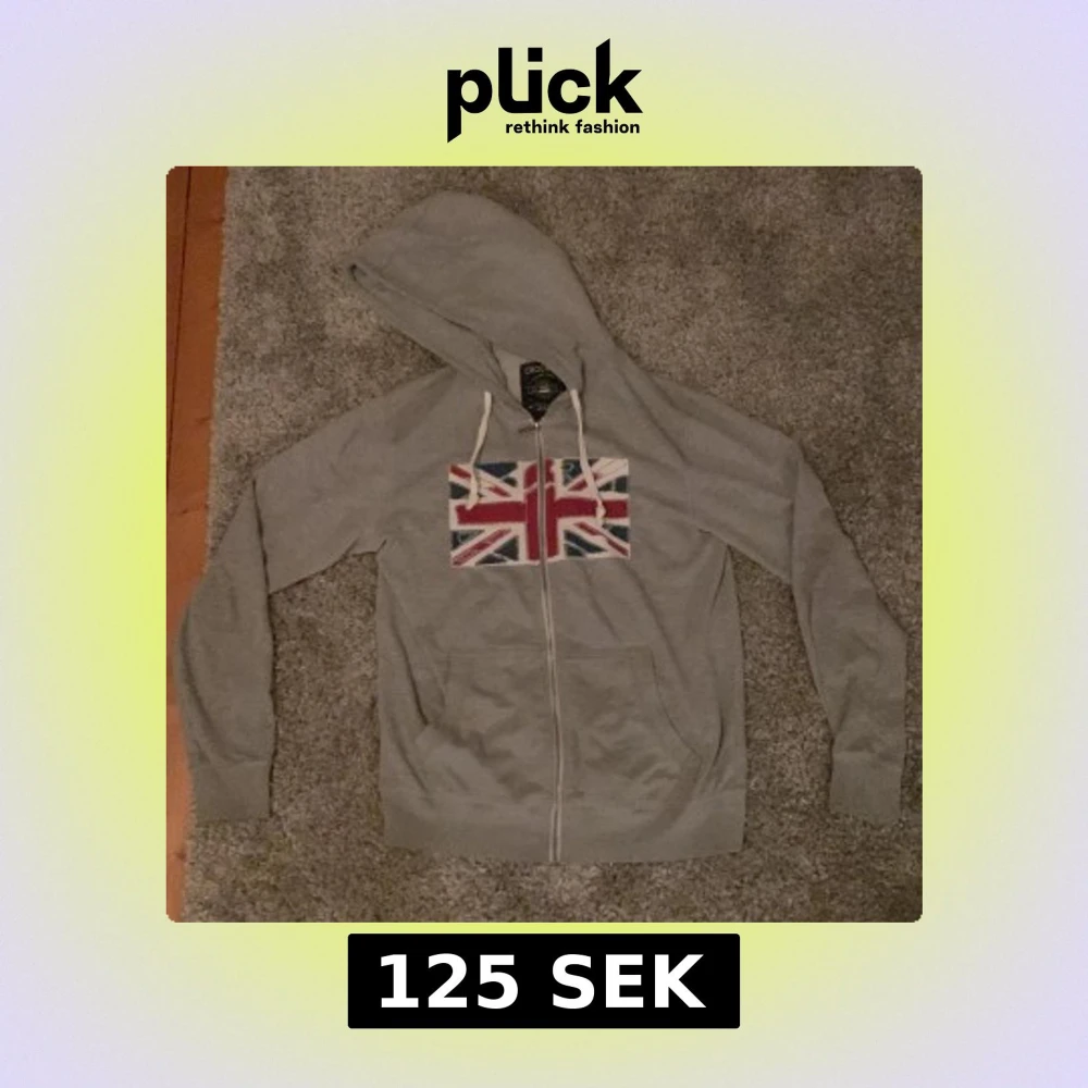 Grå hoodie från Crocker med dragkedja och huva. På bröstet finns ett stort Union Jack-tryck i rött, blått och vitt. Tröjan har långa ärmar och vita snören vid huvan. Perfekt för en avslappnad stil. Finns det frågor är det bara att ställa!