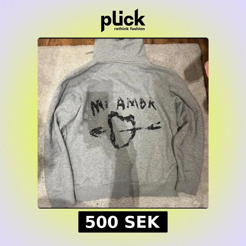 Grå hoodie från Mira Paris med svart tryck på ryggen där det står 'Mi Amor' och ett hjärta genomborrat av en pil. Tröjan har huva och är tillverkad i mjuk bomull. Perfekt för dig som gillar streetstyle och vill sticka ut med coolt print.