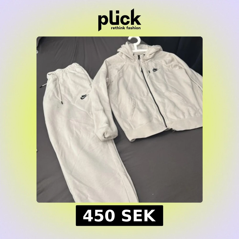 Säljer en grå hoodie och matchande byxor från Nike. Hoodien har dragkedja och fickor framtill med Nike-logga på bröstet. Byxorna har elastisk midja med dragsko och Nike-logga på benet. Perfekt för en avslappnad stil. Byxa L, Kofts M