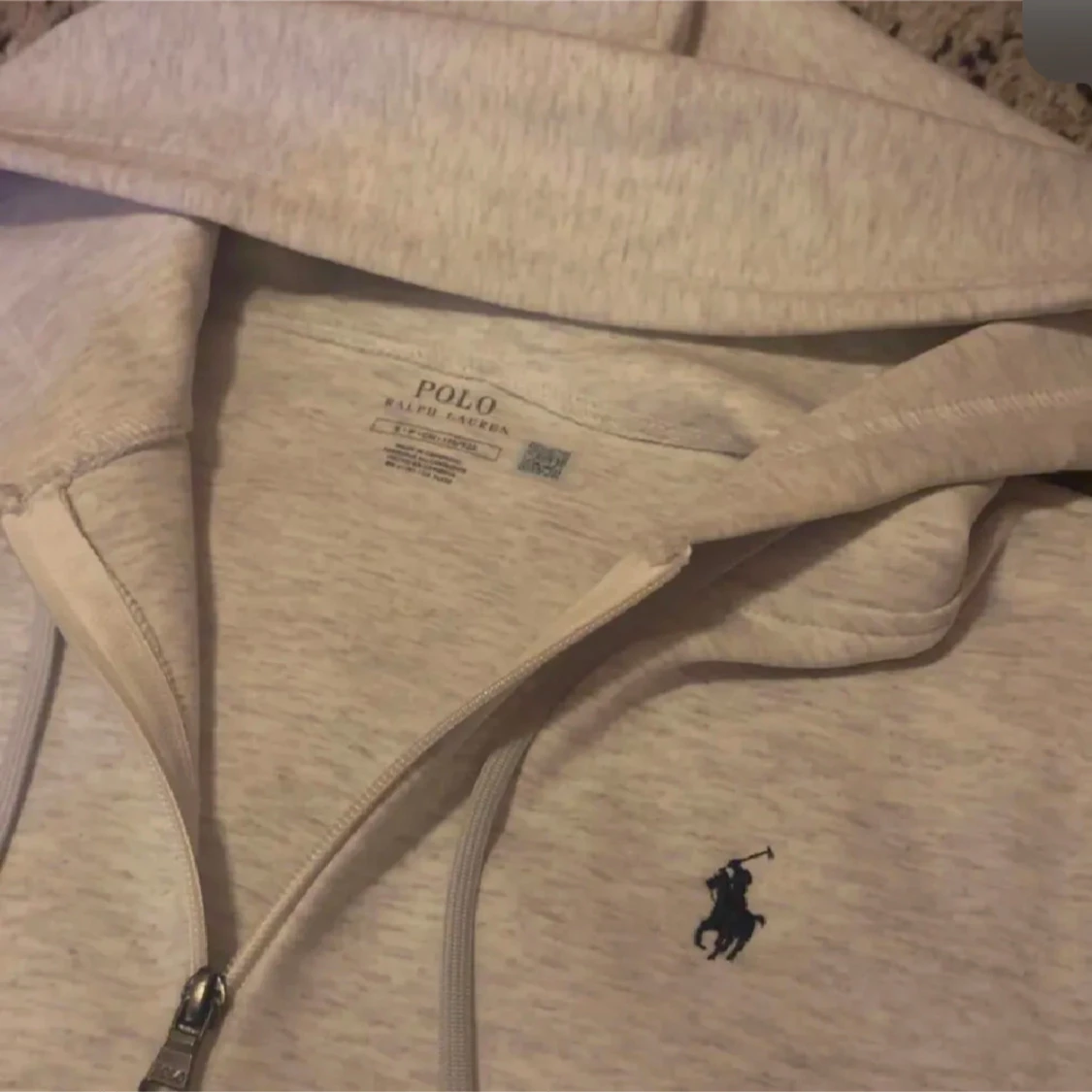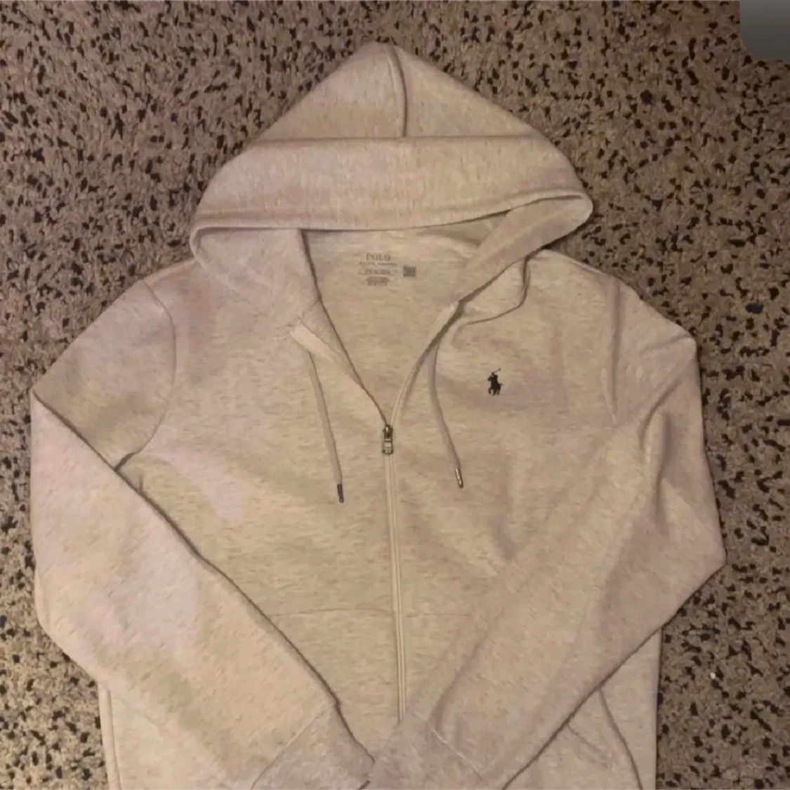 Säljer en stilren grå hoodie från Polo Ralph Lauren med dragkedja och det klassiska logotypbroderiet på bröstet. Perfekt för en avslappnad look. Den har en justerbar huva och långa ärmar. Med byxor