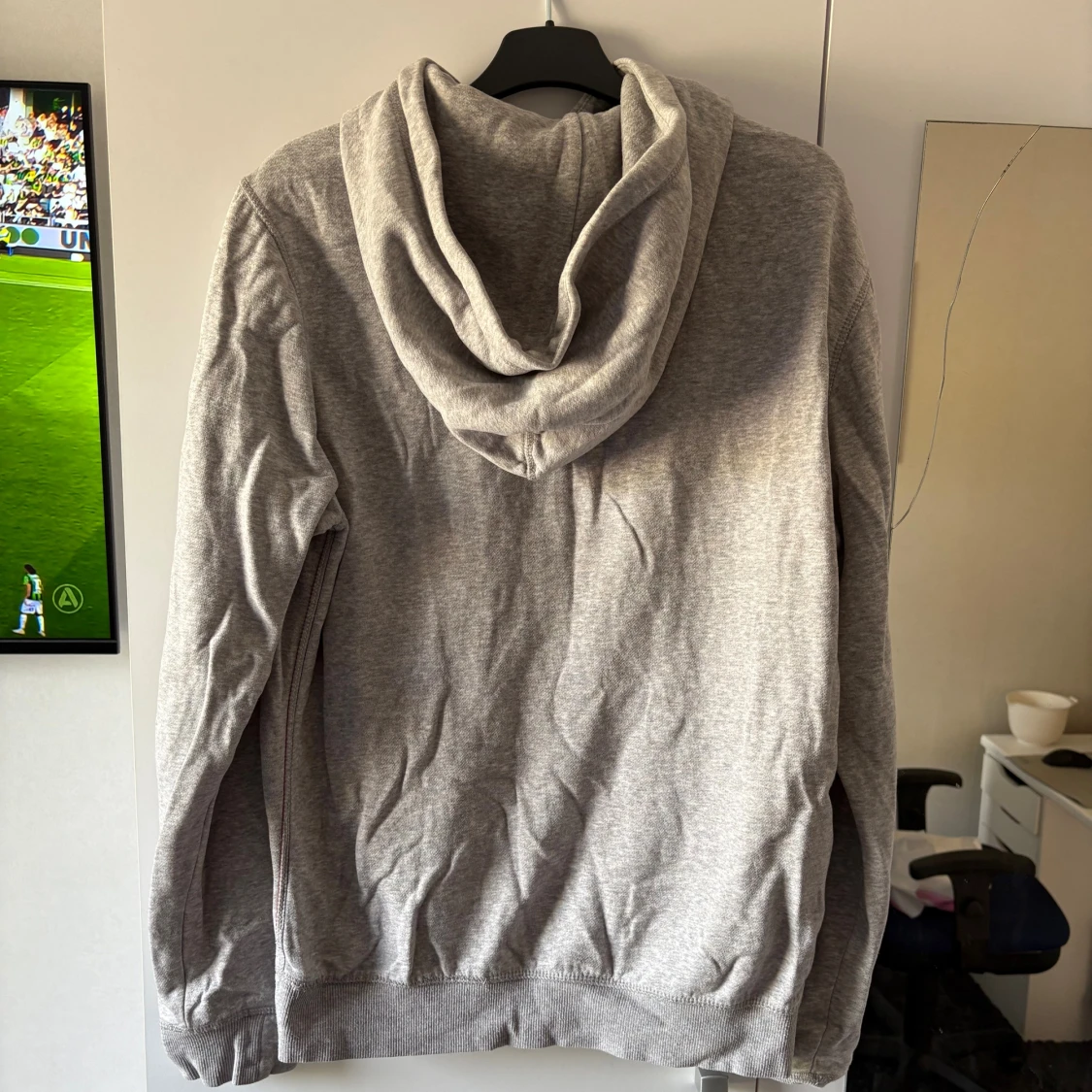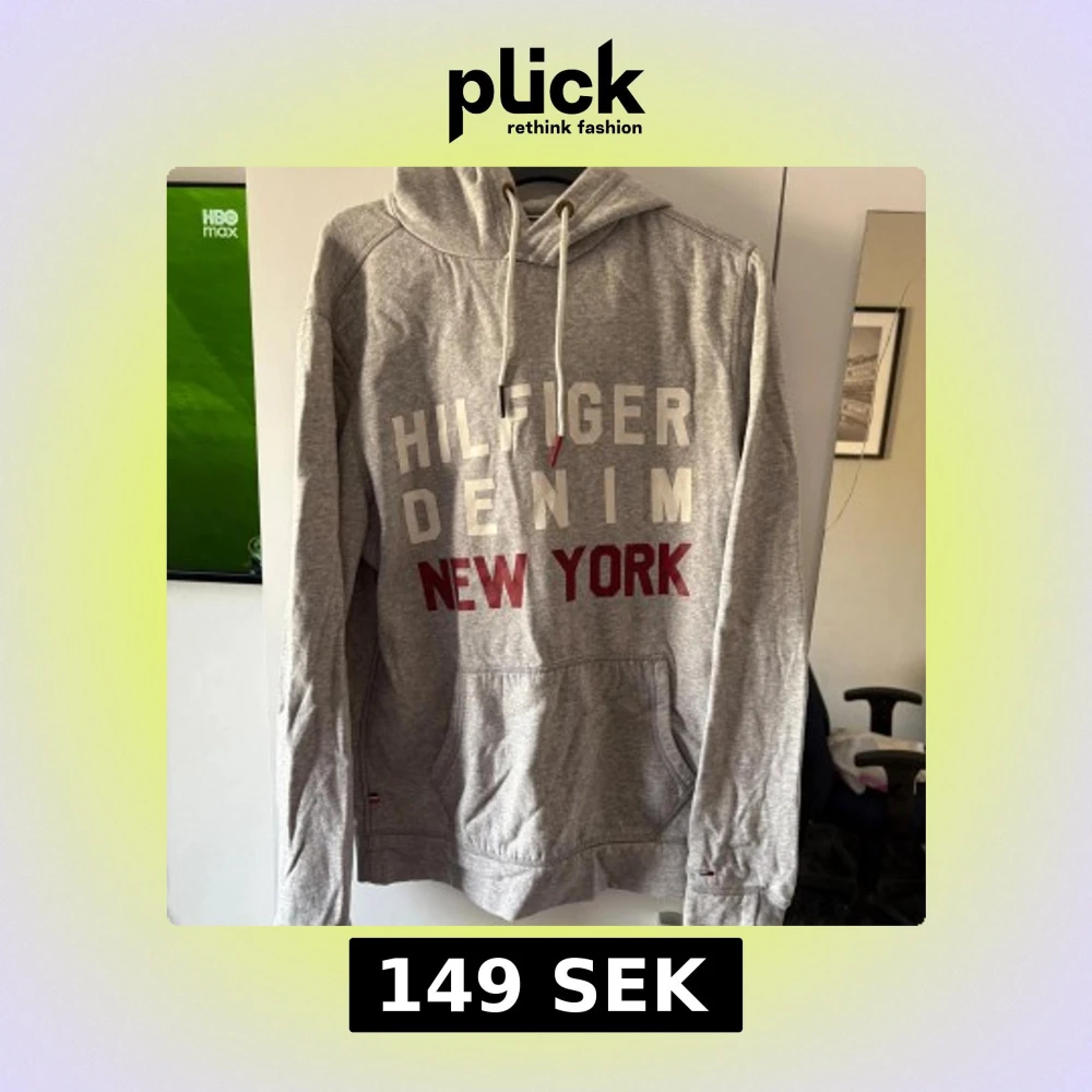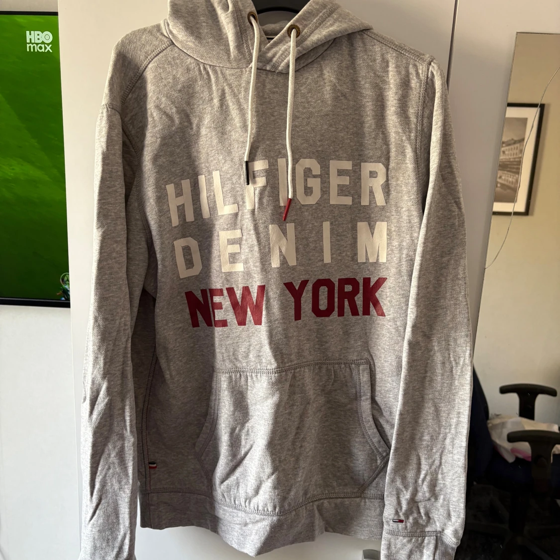 Snygg grå hoodie från Tommy Hilfiger Denim med stor vit och röd text på bröstet. Tröjan har huva med dragsko, känguruficka och långa ärmar. Perfekt för en chill och avslappnad stil. Passar dig som gillar streetwear och klassiska märken.