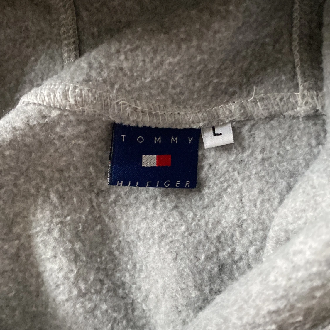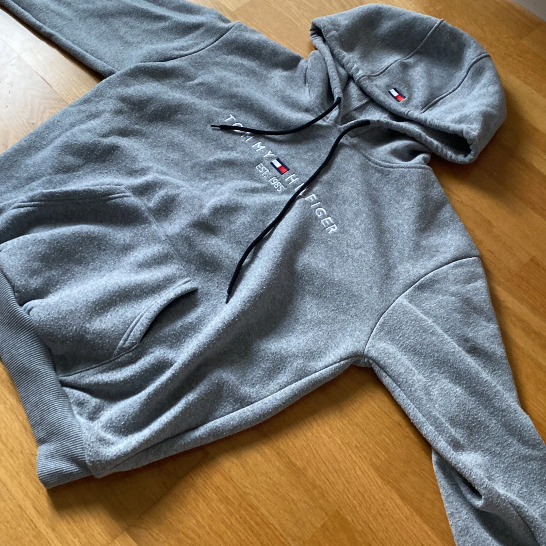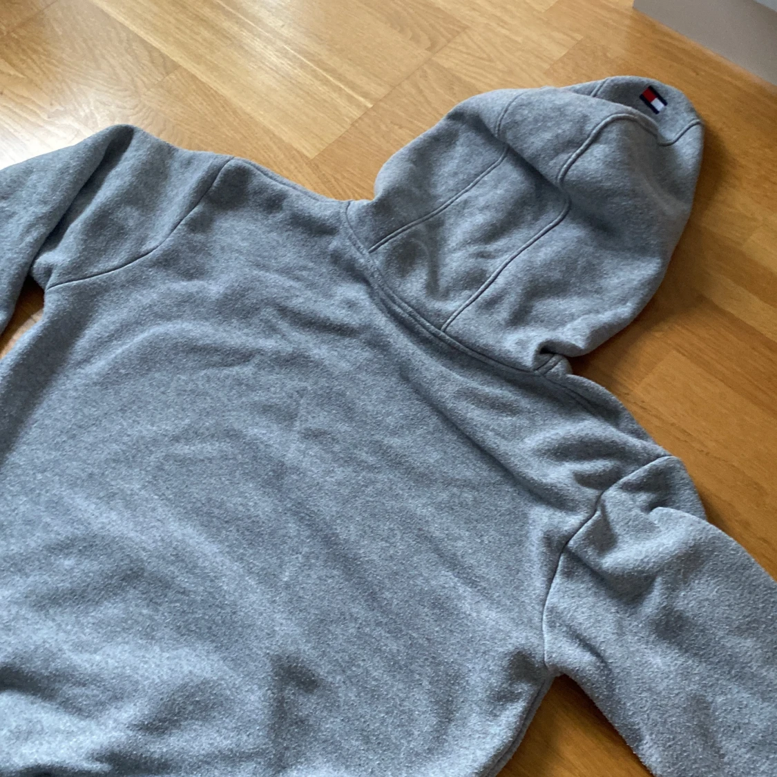 Säljer en grå hoodie från Tommy Hilfiger i storlek L. Tröjan har broderad logga och text på bröstet, klassisk känguruficka och svarta snören i huvan. Mjuk och skön bomullsmix, perfekt för chill dagar. Ribbad mudd vid ärmslut och nederkant.
