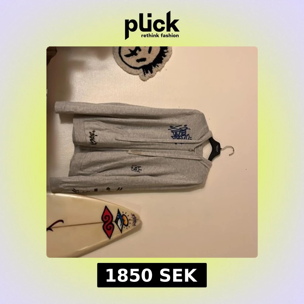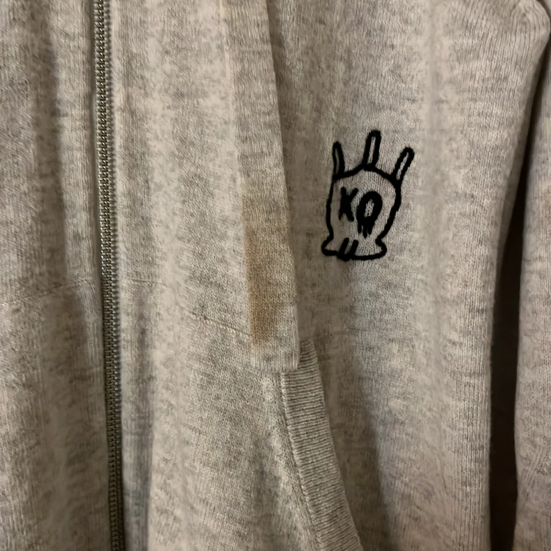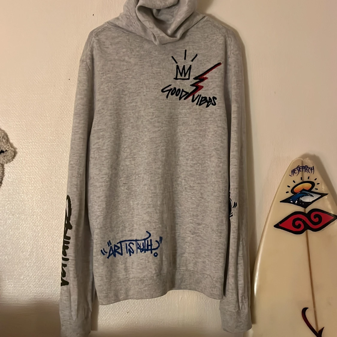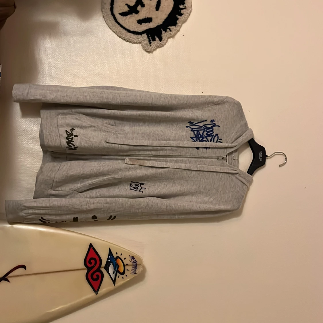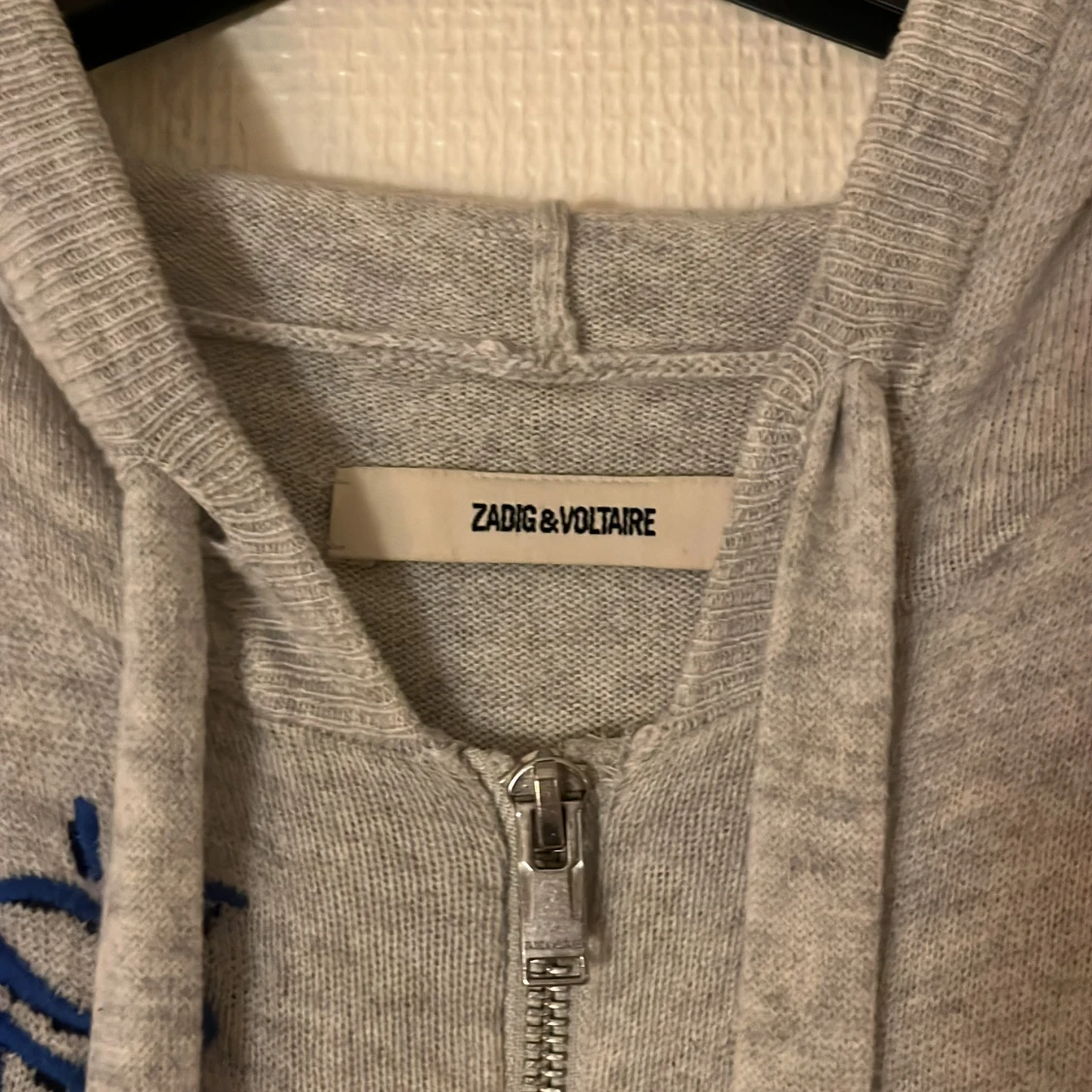 Grå hoodie från Zadig & Voltaire med coola grafitti-inspirerade tryck och broderier i blått och svart. Tröjan har dragkedja framtill, huva och långa ärmar. Mjuk bomullskänsla och streetig vibe, perfekt för dig som gillar unika detaljer.