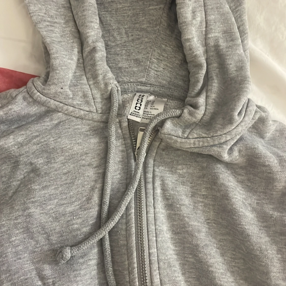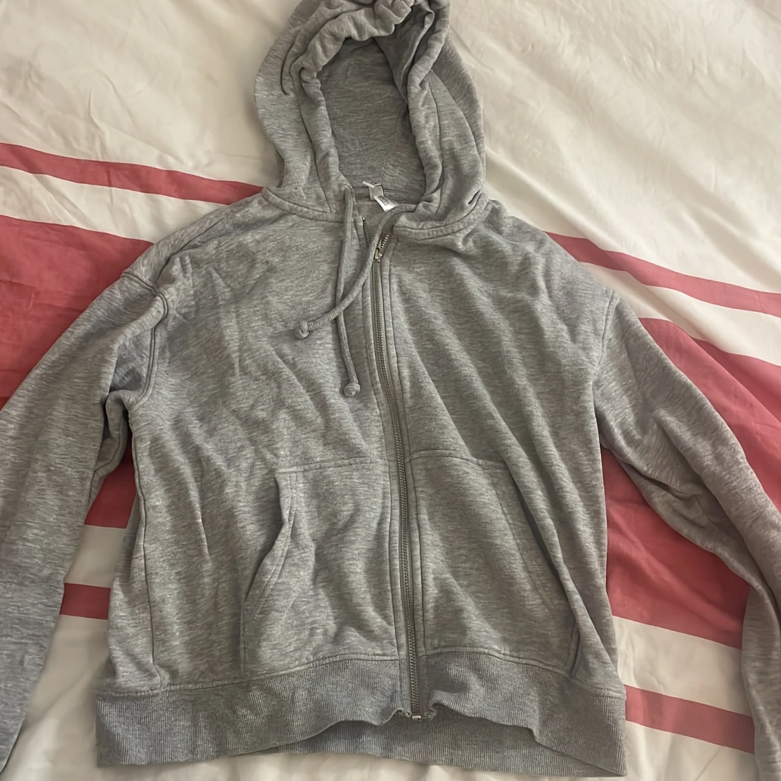Säljer en klassisk grå hoodie med dragkedja och justerbar huva. Perfekt för en avslappnad stil. Den har långa ärmar och praktiska fickor framtill. Passar perfekt för kyliga dagar eller mysiga hemmakvällar.