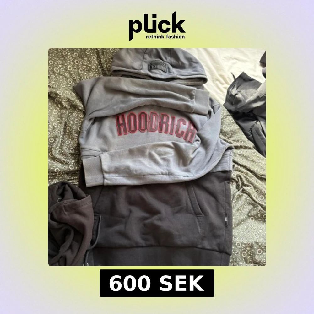 Snygg grå tracksuit från HOODRICH med stor röd och svart logga på bröstet ich en röd svart logga vid låret på byxorna.