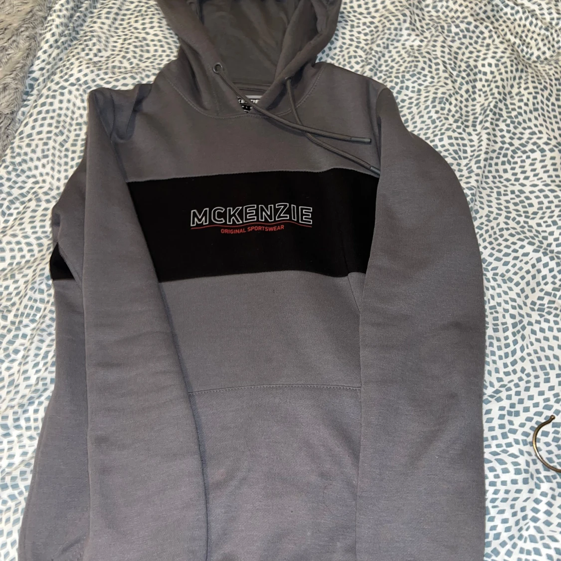 Säljer en snygg och bekväm grå hoodie från McKenzie. Den har en stor ficka på framsidan och en svart detalj med McKenzie-loggan på bröstet. Perfekt för höst och vinter, och passar bra till både vardag och träning. Hoodien är i nyskick och väldigt mjuk och skön att ha på sig. Köp direkt eller ge prisförslag 💛