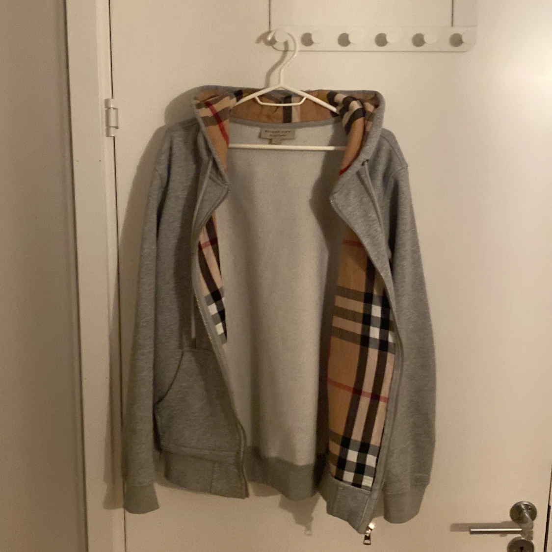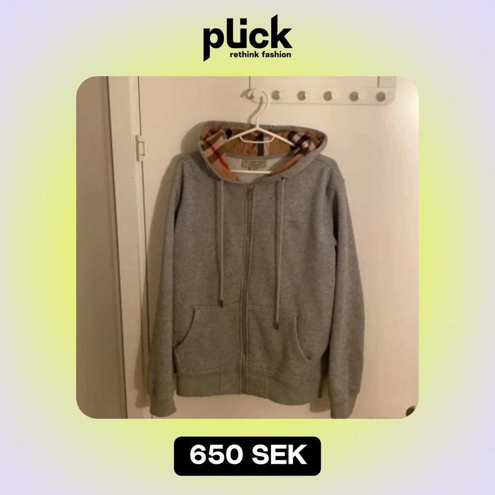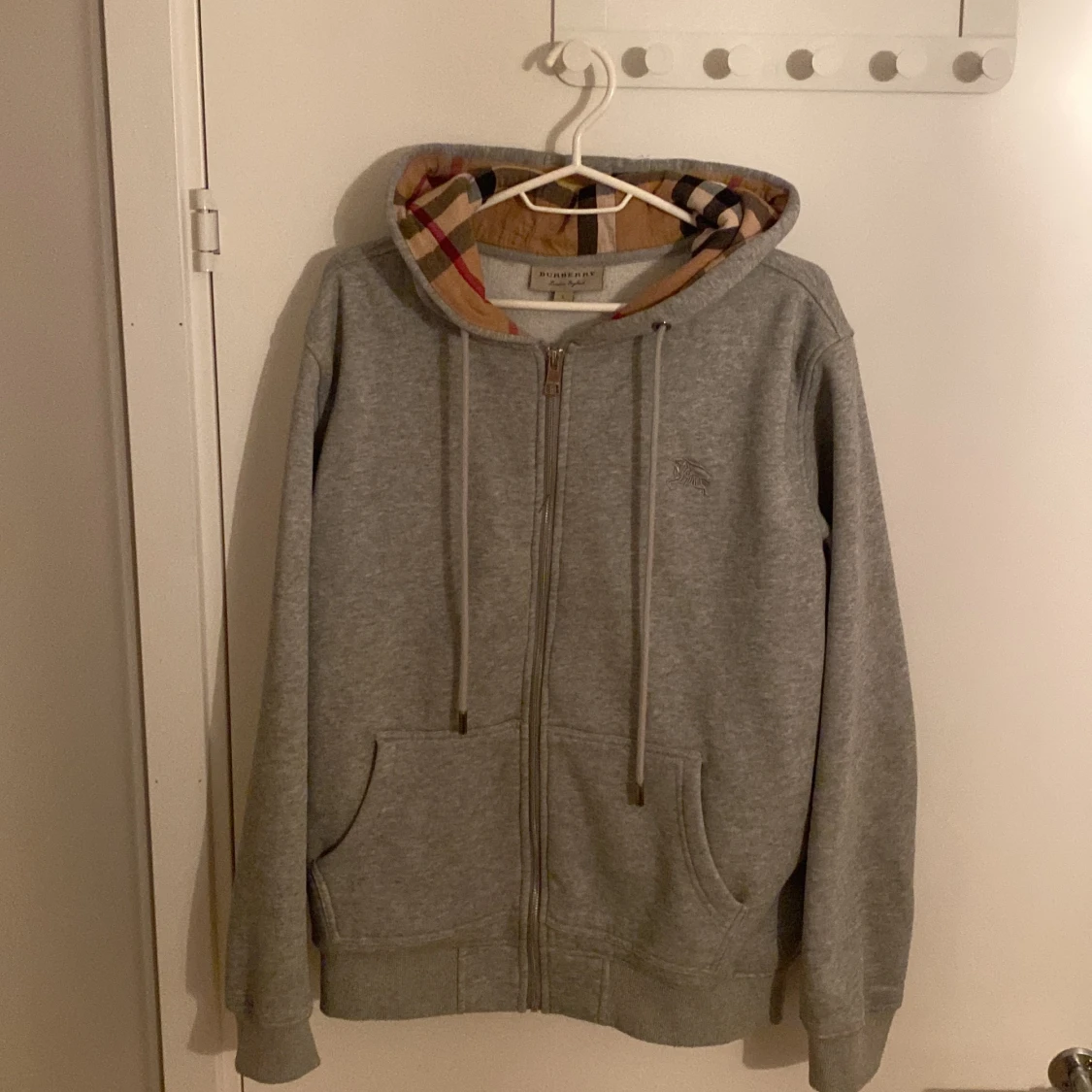 Säljer en snygg grå huvtröja från Burberry med klassiskt rutigt mönster i huvan. Tröjan har dragkedja framtill och är i nyskick. Perfekt för höst och vår! Tröjan är i storlek L men passar för dom som har M också.