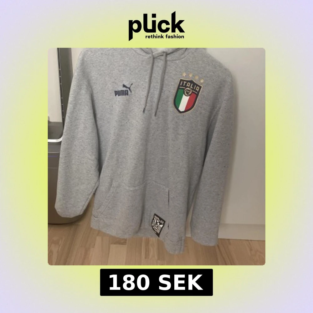 Säljer en grå hoodie från Puma med Italiens landslagstryck och coola grafiska detaljer. Tröjan har huva med snörning, stor ficka framtill och tryck både fram och bak. Perfekt för dig som gillar fotboll och streetwear.