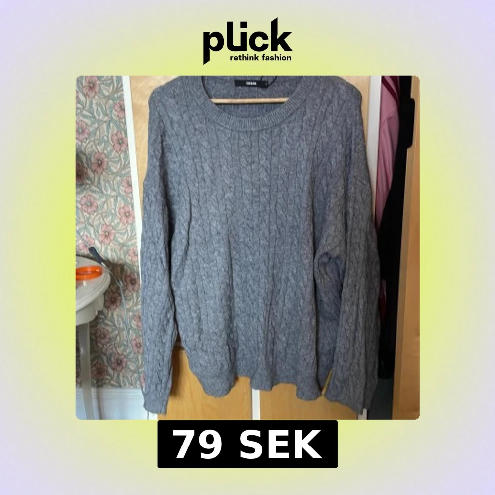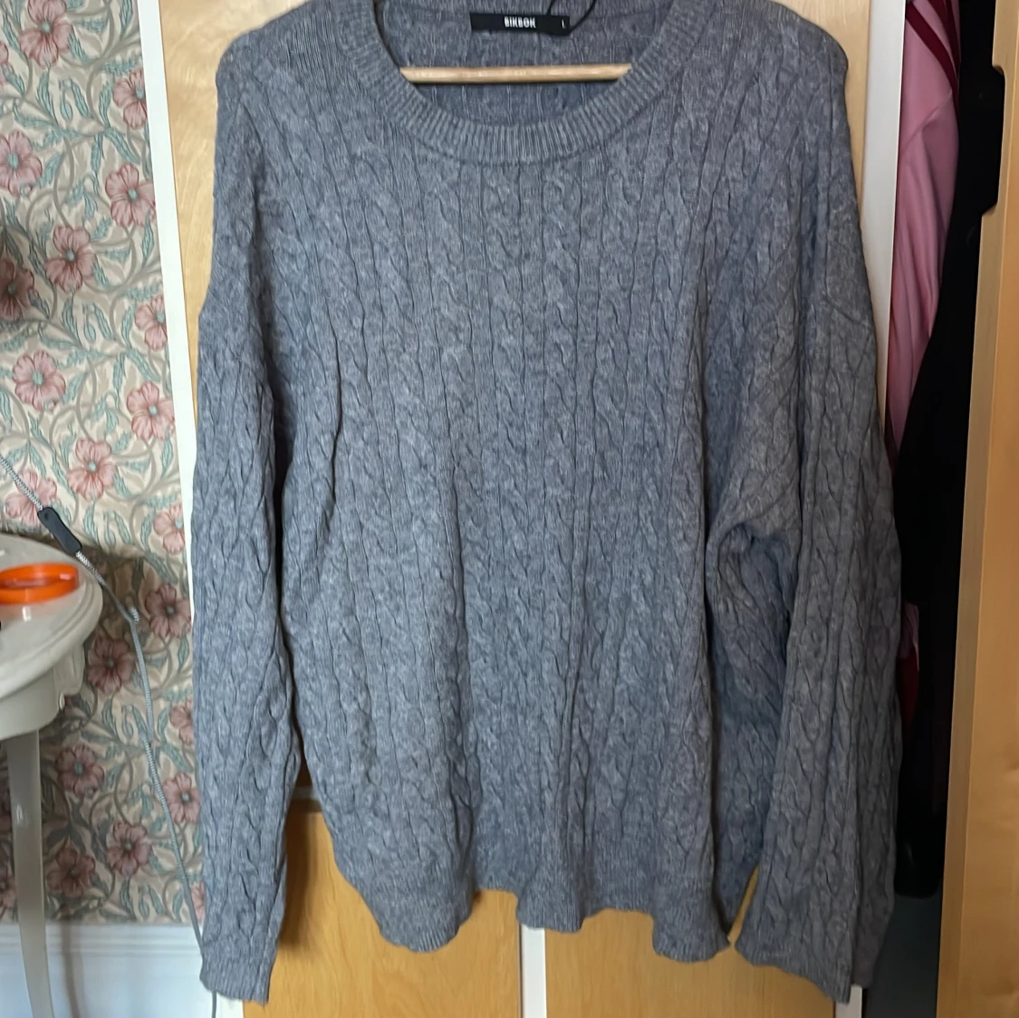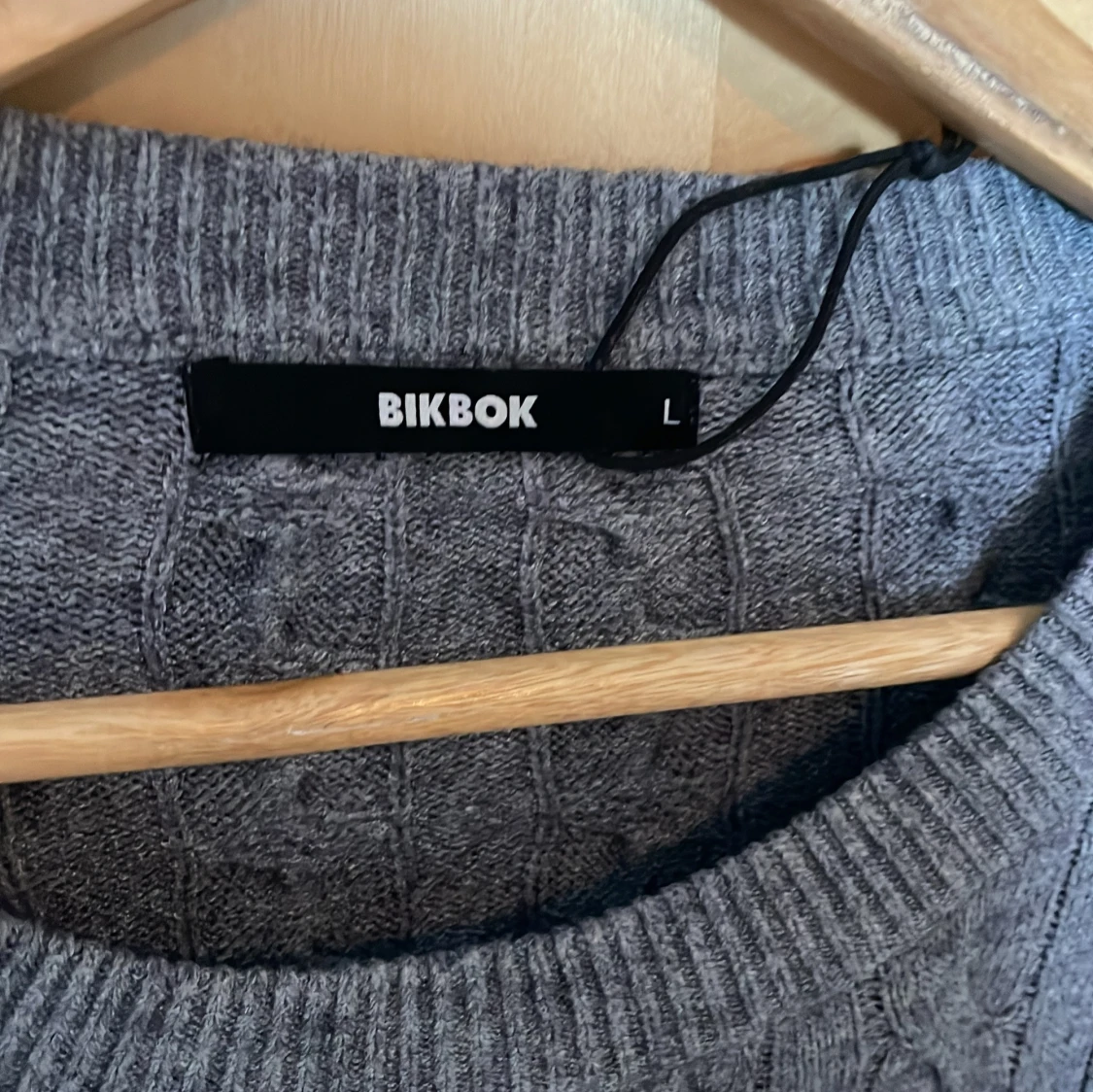 Mysig grå kabelstickad tröja från BikBok i storlek L. Tröjan har rund halsringning, lång ärm och ett klassiskt stickat mönster som ger en chill och stilren vibe. Perfekt att slänga på sig när det är kallt ute.