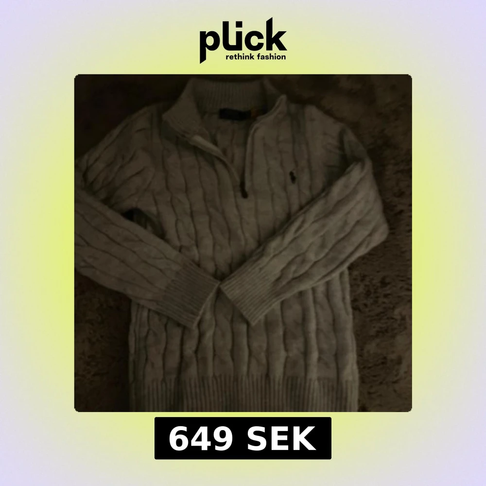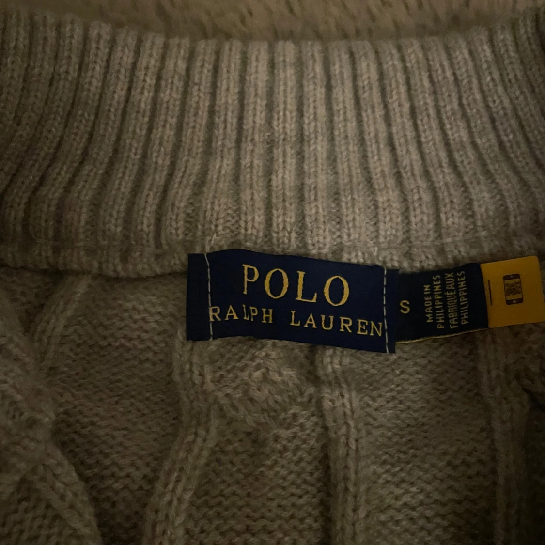 Kabelstickad grå tröja från Polo Ralph Lauren med halv dragkedja och hög krage. Klassisk design med ribbade muddar och diskret broderad logga på bröstet. Perfekt för lager-på-lager och snygg till jeans eller kjol.