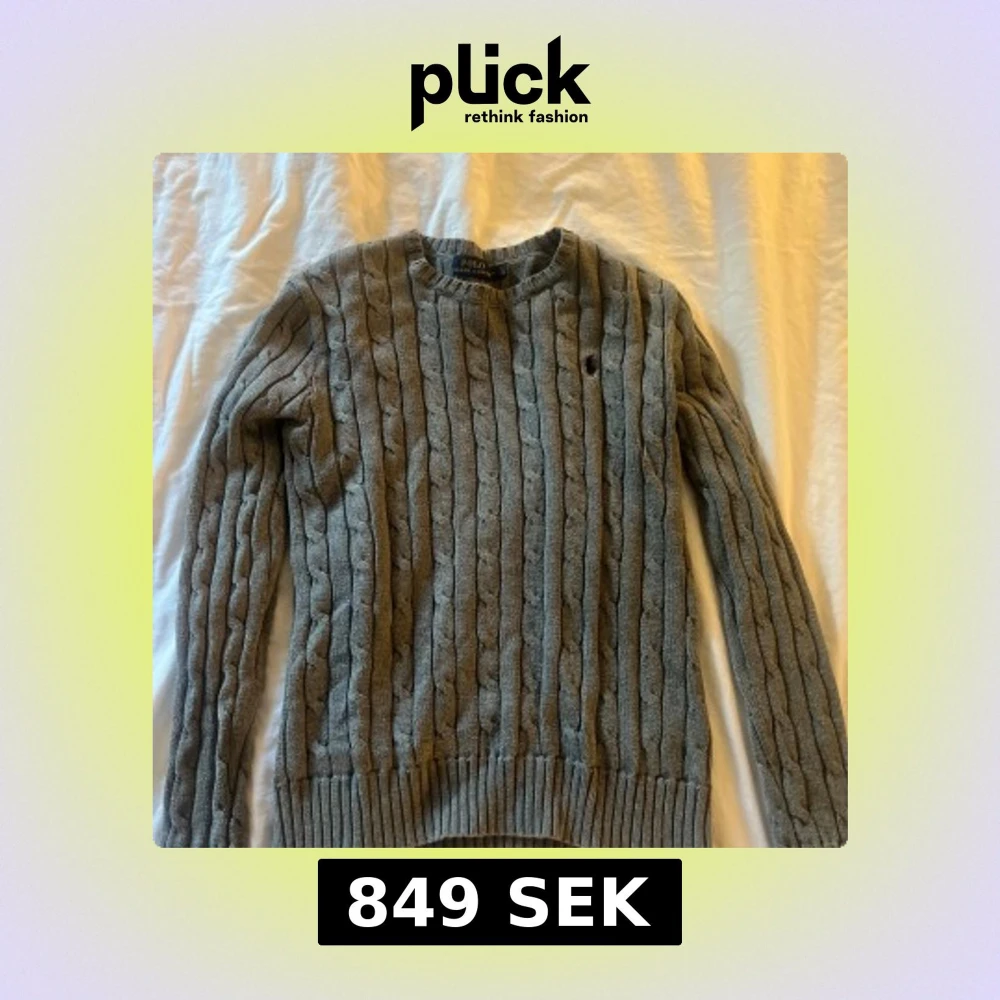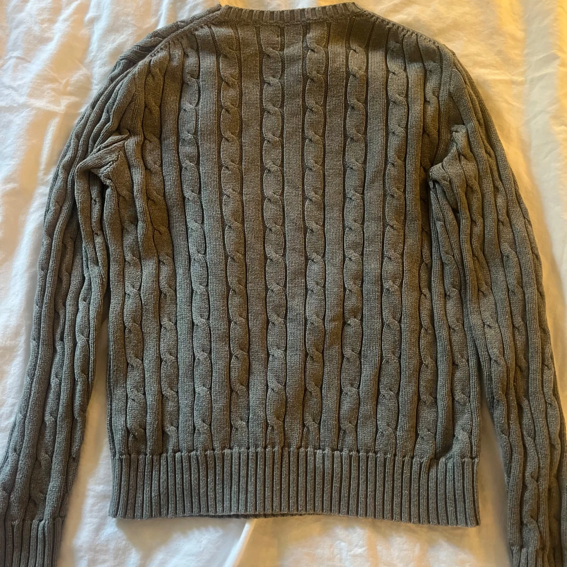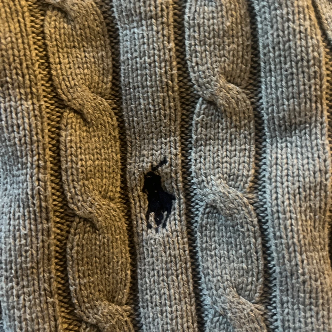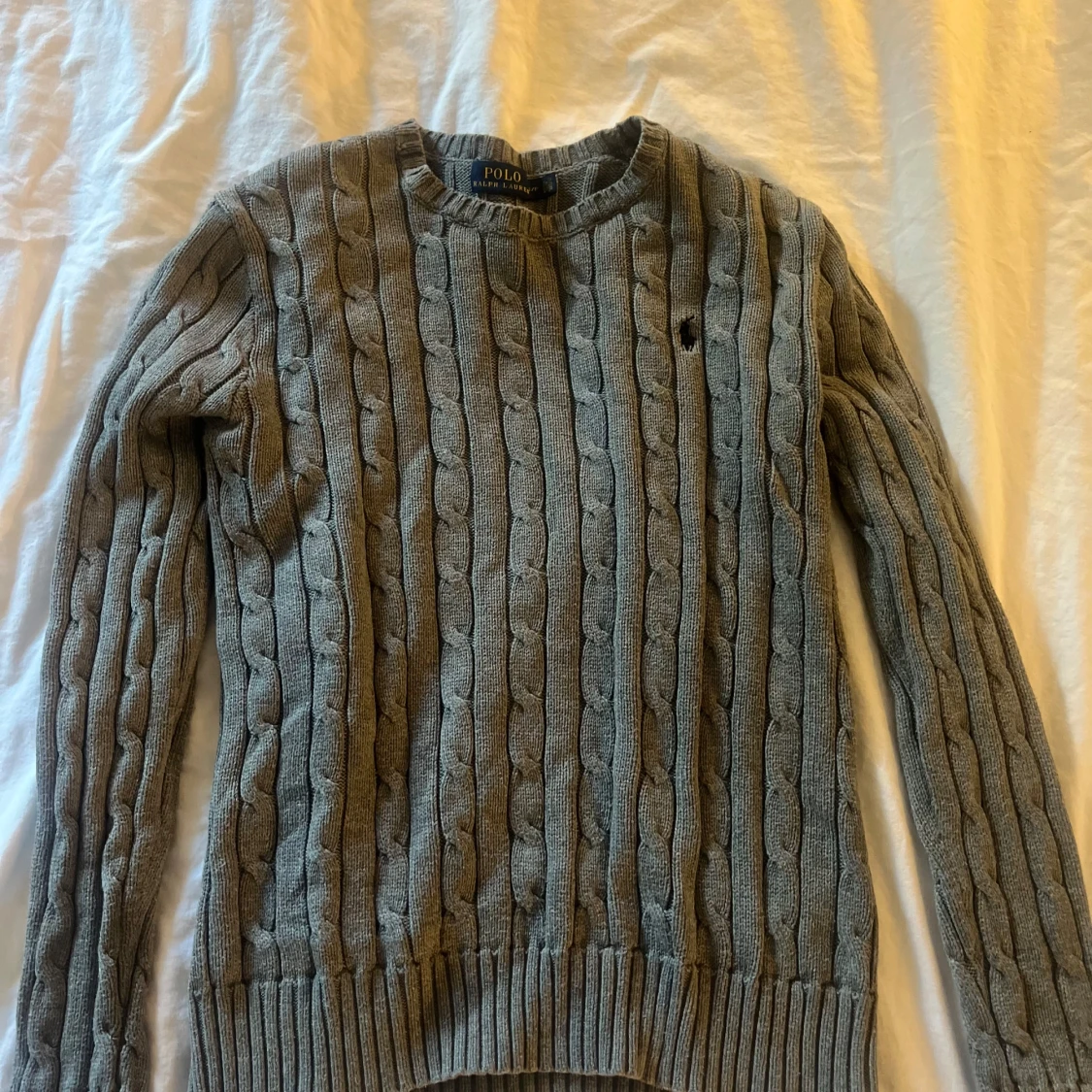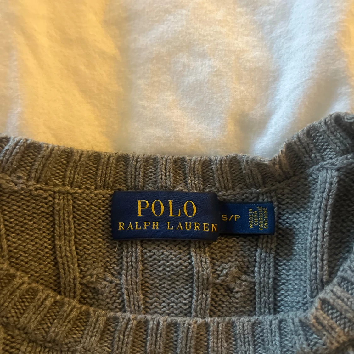 Säljer en aldrig använd grå kabelstickad tröja från Polo Ralph Lauren, med klassisk rund hals och broderad logga på bröstet. Tröjan har långa ärmar och ribbade muddar vid ärmslut och nederkant. Perfekt för dig som gillar stilren och tidlös design.