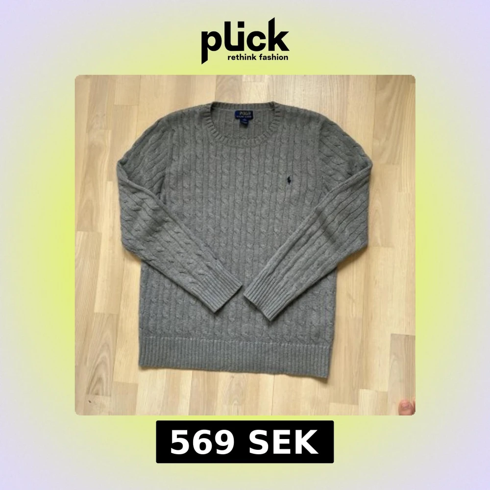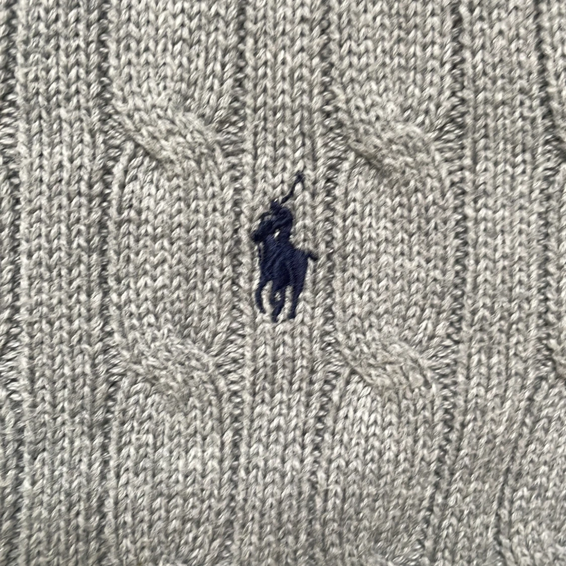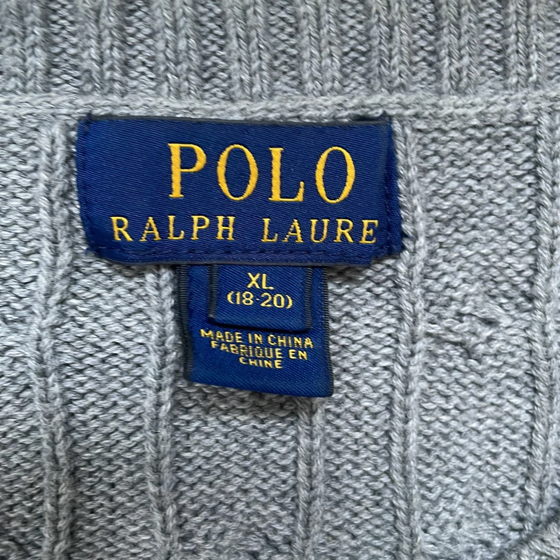 Kabelstickad grå tröja från Polo Ralph Lauren i storlek XL. Klassisk rund halsringning, långärmad och med broderad marinblå logga på bröstet. Perfekt för dig som gillar stilren och tidlös design med en preppy touch.