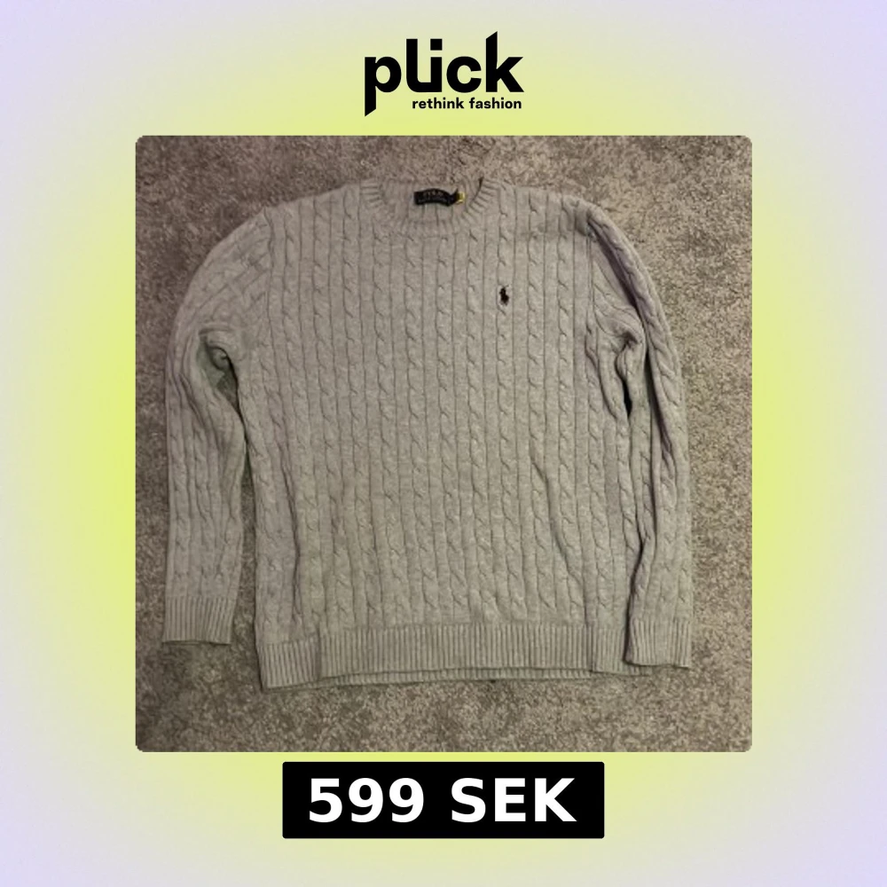 Kabelstickad grå tröja från Polo Ralph Lauren med klassisk rund halsringning och broderad logga på bröstet. Långärmad modell i mjuk bomull, perfekt för lager-på-lager, storlek M.