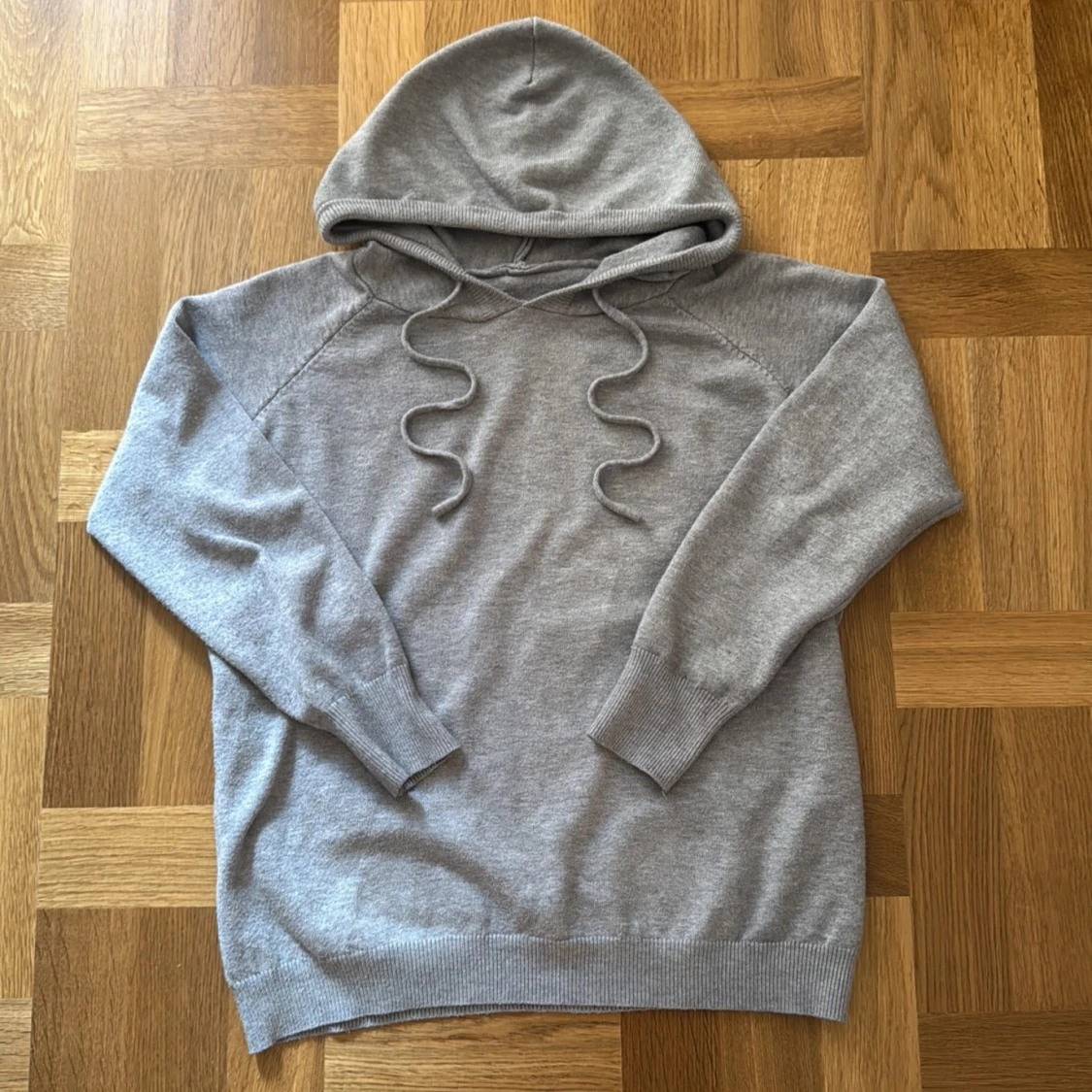 En enkel och stilren grå kashmir hoodie med huva och snörning framtill. Tröjan har långa ärmar och breda ribbade muddar vid ärmslut och nederkant. Perfekt för chill dagar och passar till det mesta. Materialet känns mjukt och är väldigt skönt enligt mig.