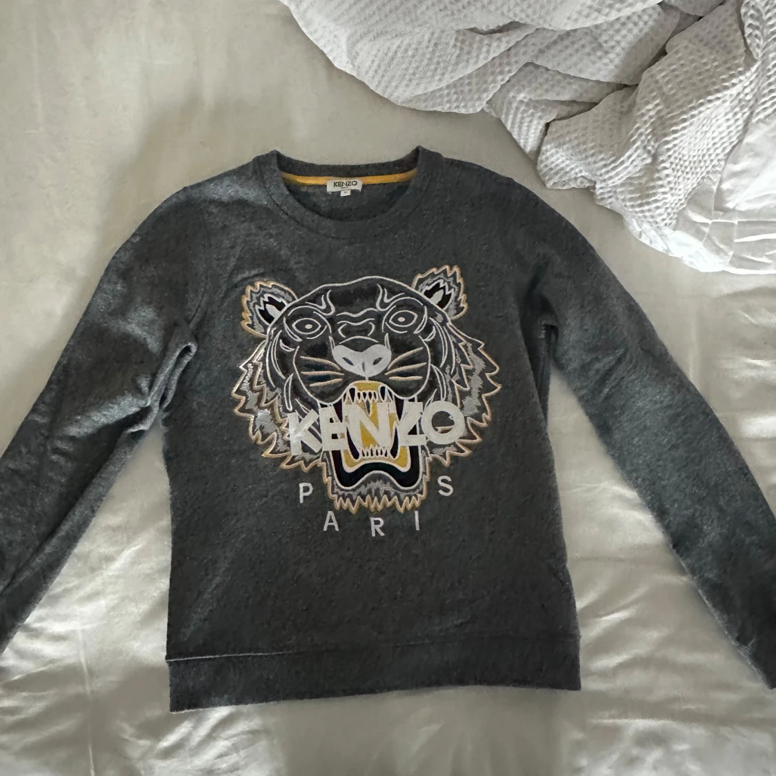 Skitsnygg grå tröja från Kenzo med tigertryck och logga framtill. Säljer då den är lite för liten för mig. Tröjan är i superfint skick och använts sparsamt. Tröjan är i S men är liten i storlek o sitter som en xs. Köparen står för frakten!
