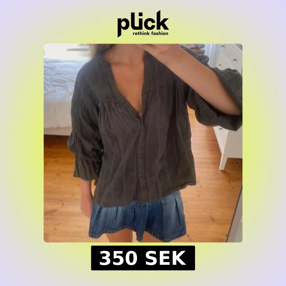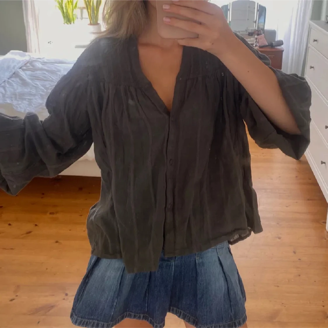 Säljer en blus med v-ringning och knappar framtill. Blusen har vida, trekvartsärmar och är tillverkad i ett lätt, luftigt material som ger en avslappnad känsla. Perfekt för dig som gillar en chill och stilren look.
