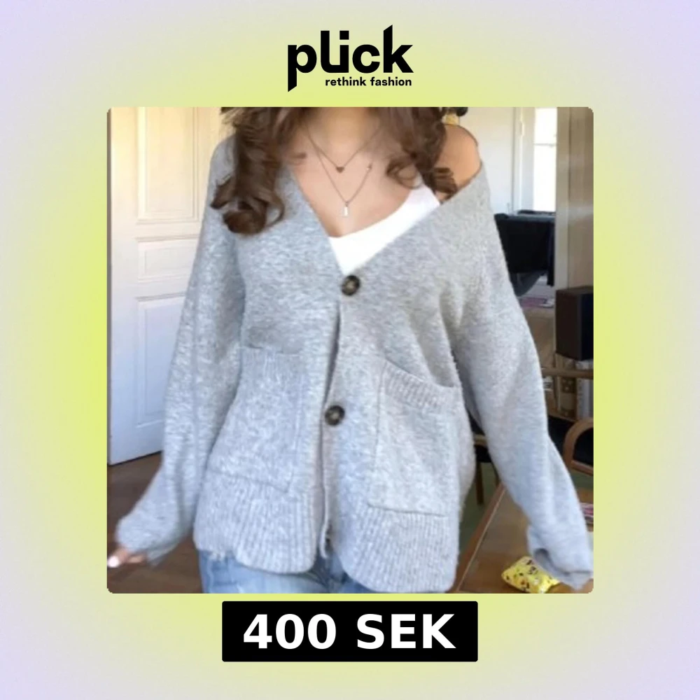 Mysig grå kofta med v-ringning och stora knappar framtill. Koftan har två praktiska fickor och är stickad i ett mjukt material. Passformen är lite loose och ärmarna är långa, perfekt att slänga över en topp för en chill look.