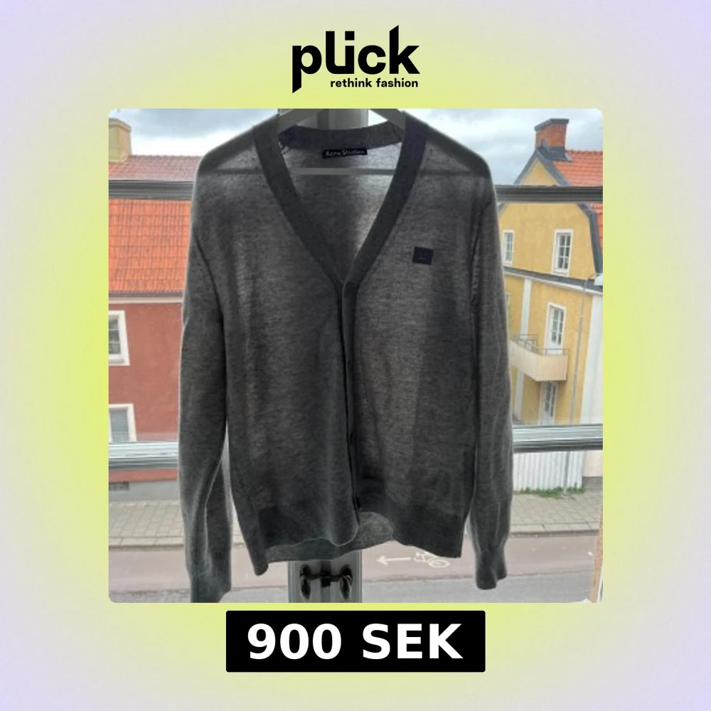 Säljer en stilren grå kofta från Acne Studios med v-ringning och knäppning framtill. Koftan har långa ärmar och en liten svart logotyp på bröstet. Perfekt för lager-på-lager och enkel att matcha.