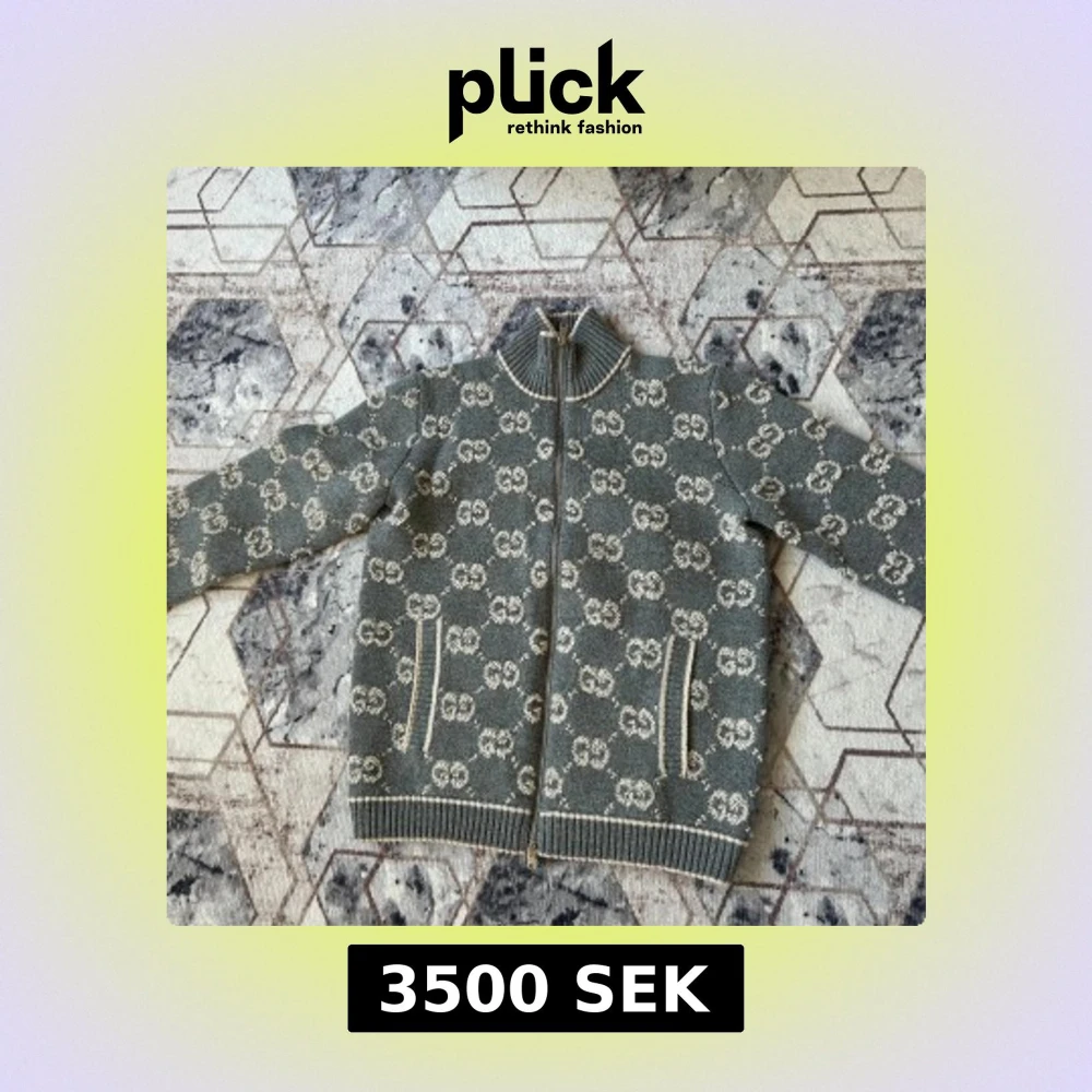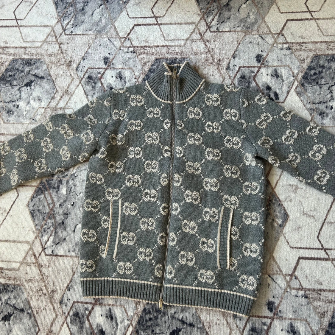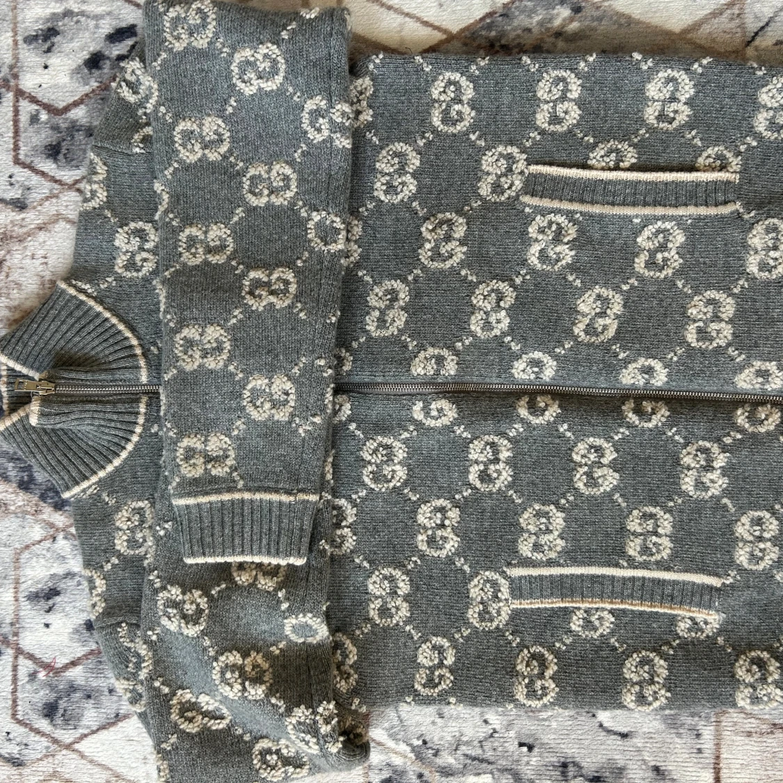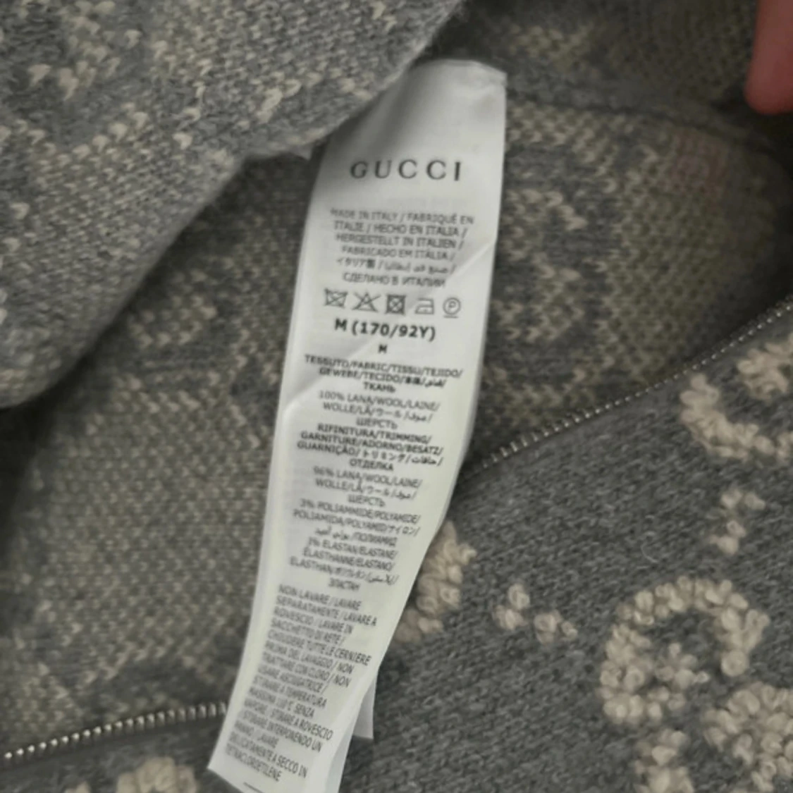 Exklusiv grå kofta från Gucci i 100% ull med hel dragkedja och ribbade muddar. Tröjan har ett snyggt mönster med Guccis klassiska GG-logga i vitt över hela plagget och två fickor framtill. Perfekt för dig som vill sticka ut med lyxig streetstyle.