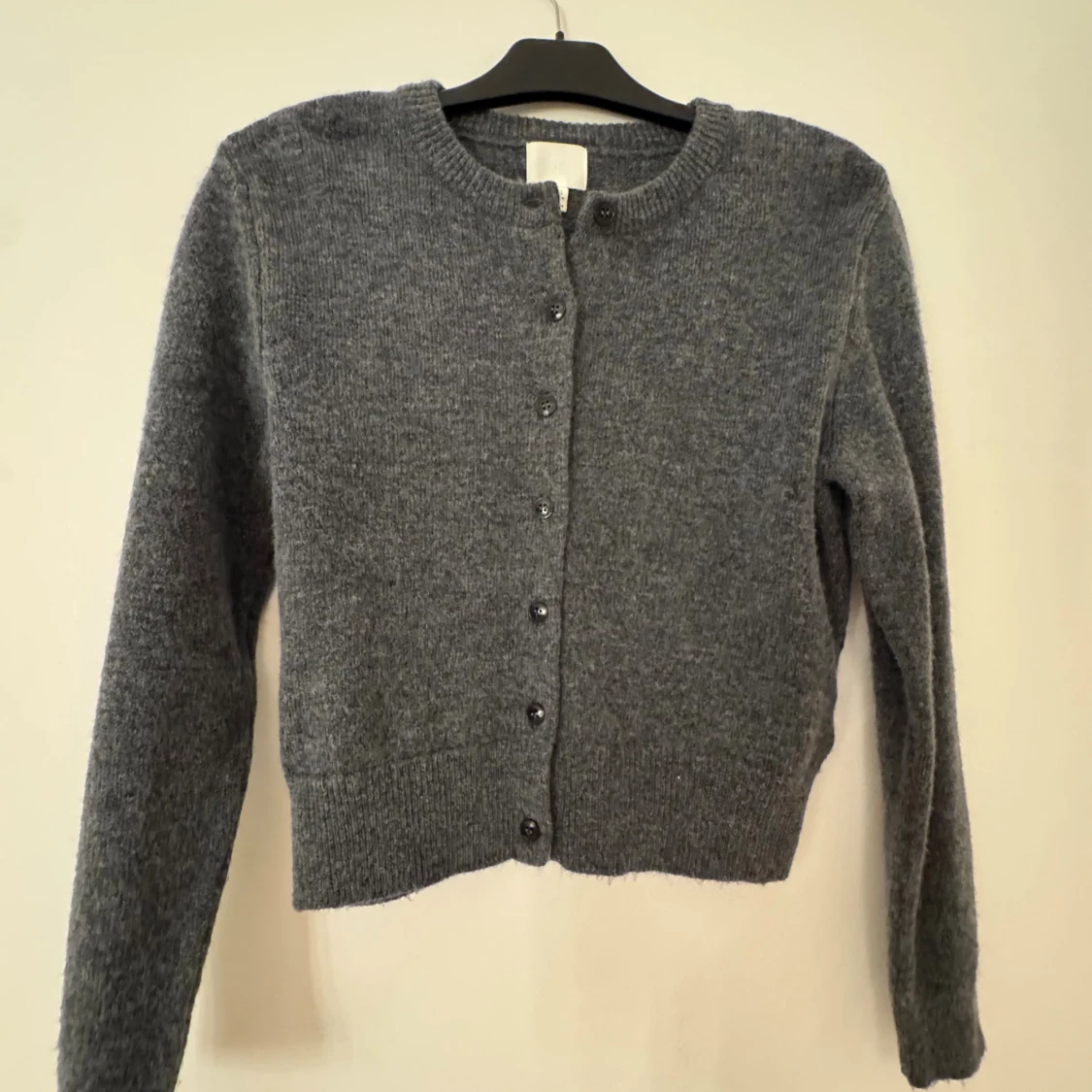 Mysig grå kofta från H&M i storlek XS, tillverkad i mjuk ullblandning. Modellen är croppad med rund hals och knappar framtill. Perfekt att slänga över en t-shirt eller linne när det är kyligt ute. Klassisk och enkel design som funkar till allt.