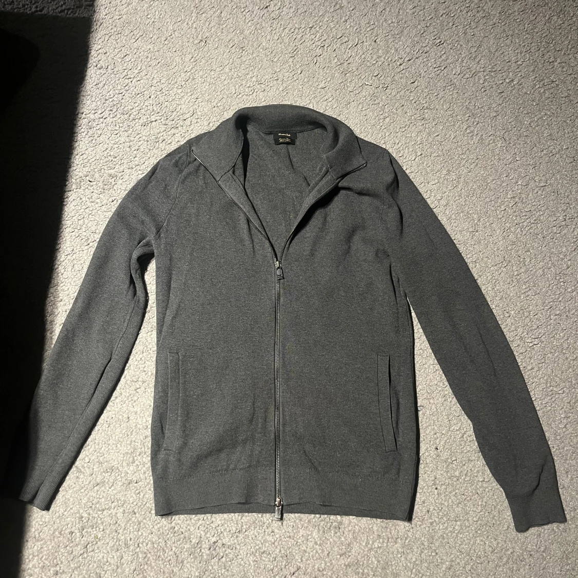 Snygg grå kofta från Massimo Dutti i extra fin bomull. Modellen har hel dragkedja framtill, ribbade muddar och två fickor. Perfekt för lager-på-lager och chill stil. Passar dig som gillar klassisk look med modern touch.