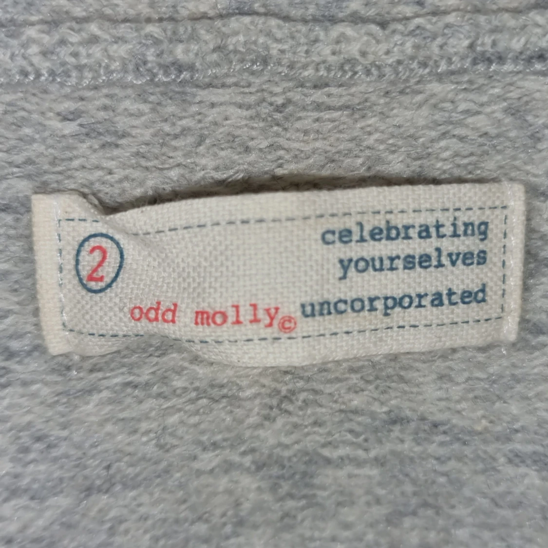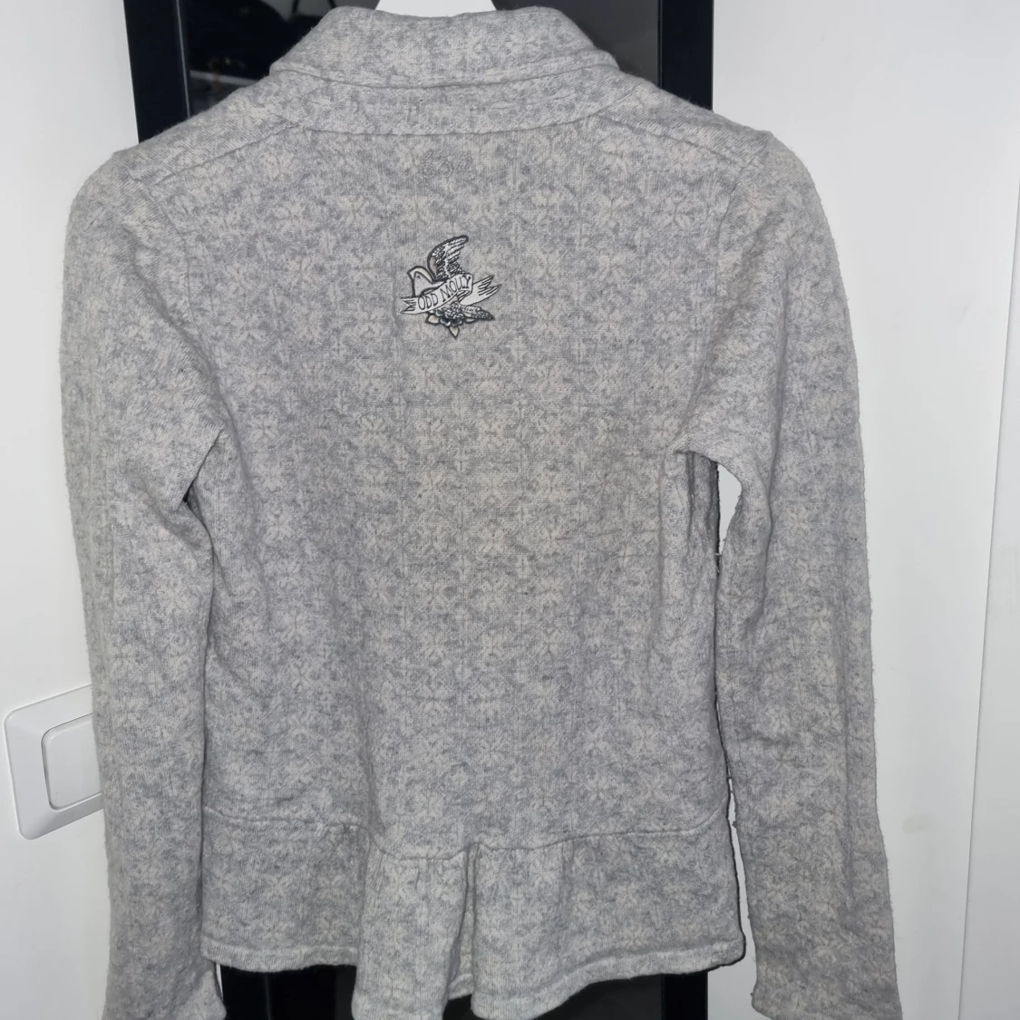 Säljer en mysig grå kofta från Odd Molly med en rosa rosett framtill. Koftan har ett broderat mönster på ryggen och långa ärmar.