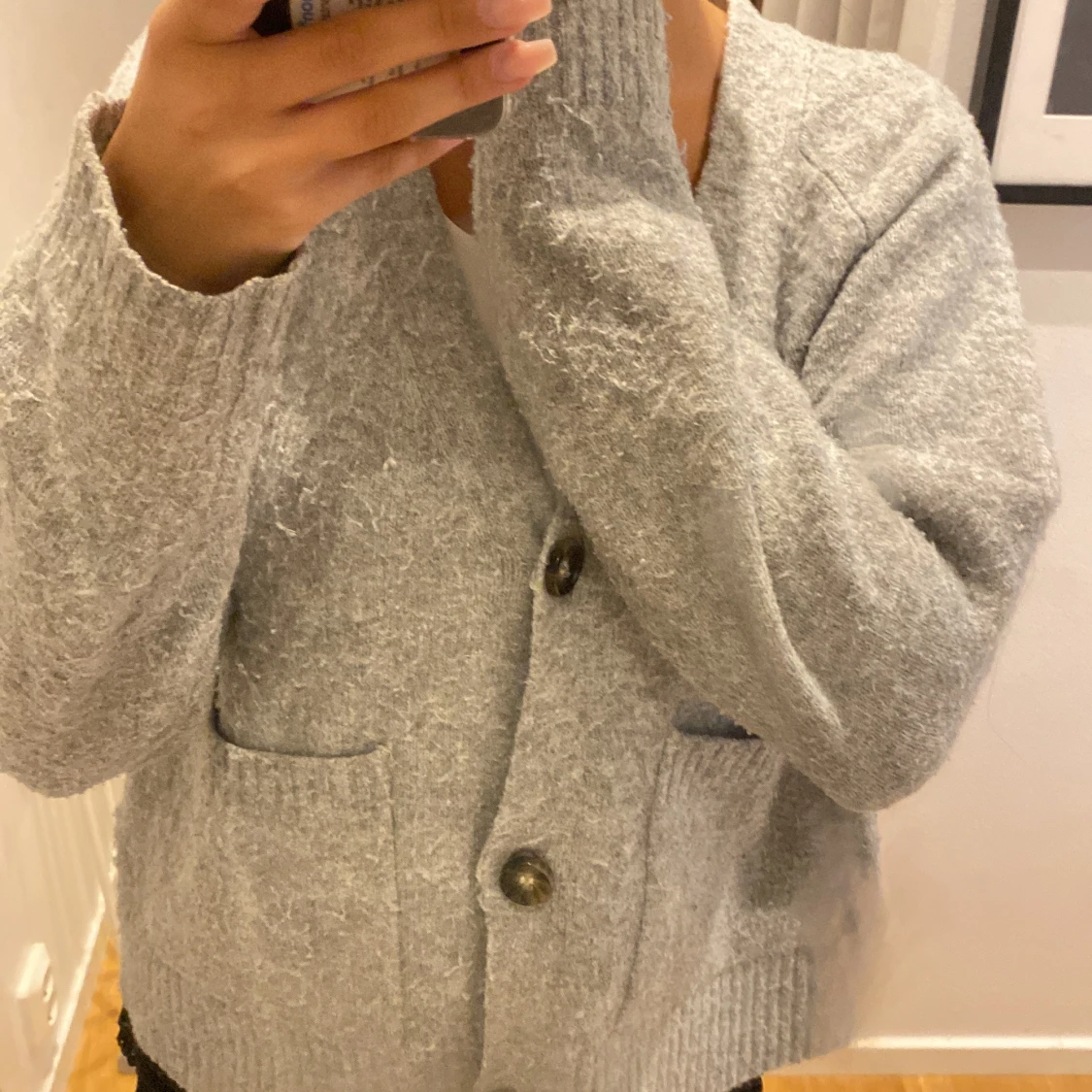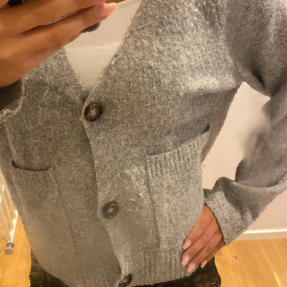 Mysig grå kofta från Vero Moda med stora knappar framtill och två fickor.
