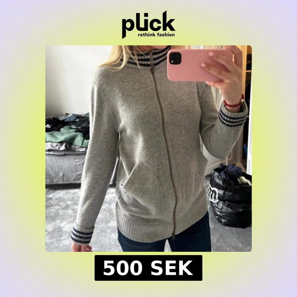 Säljer en stilren grå Kashmir kofta med dragkedja och randiga detaljer i blått på krage och ärmslut. Kragen kan anpassas till hur du vill ha det. Perfekt för en avslappnad look. Koftan har långa ärmar och praktiska fickor framtill.