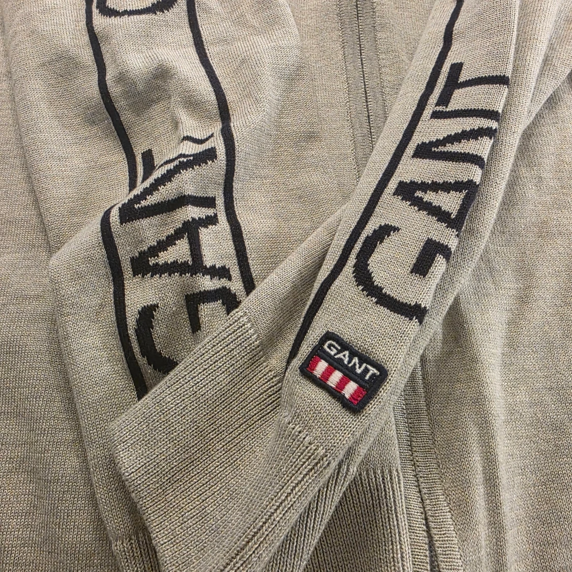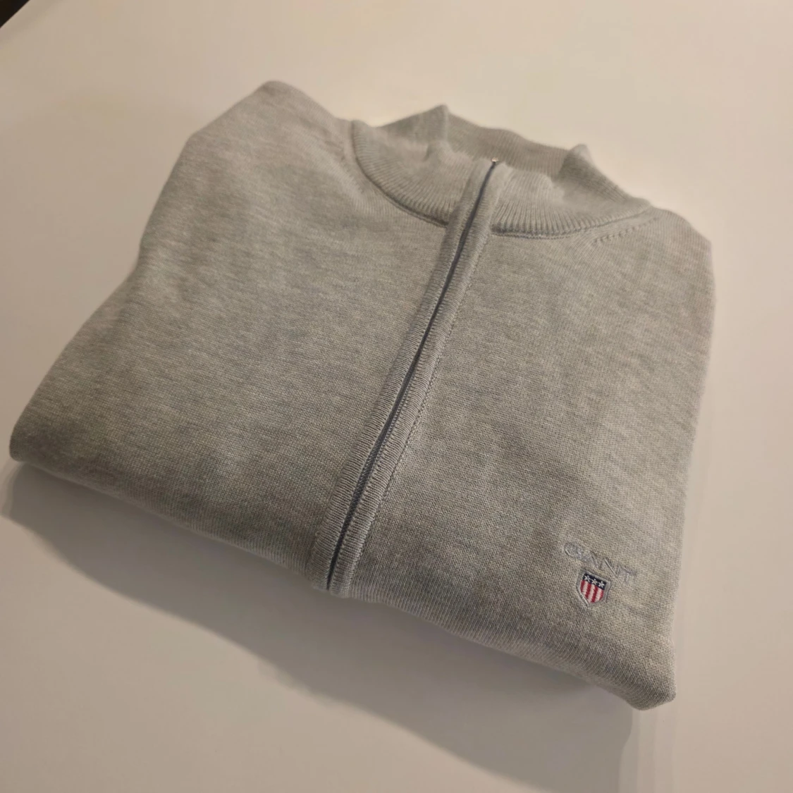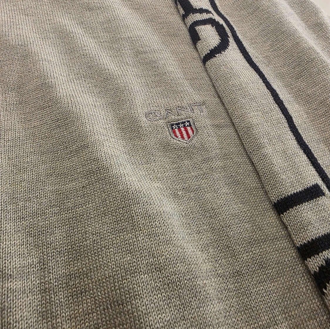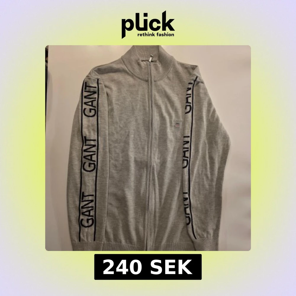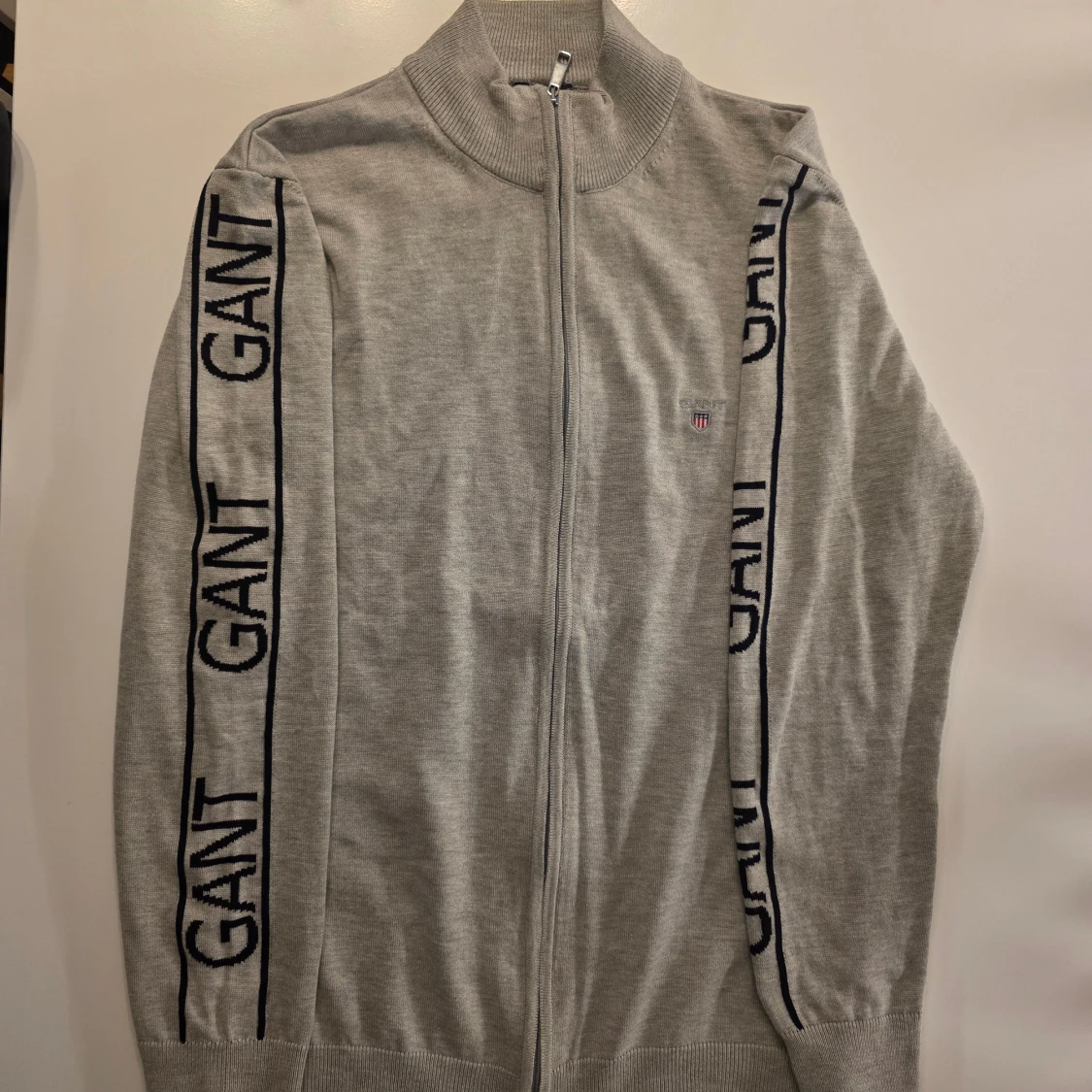 Snygg grå kofta från GANT i 100% bomull med hel dragkedja och ribbade muddar. Svarta GANT-loggor längs båda ärmarna och liten broderad logga på bröstet. Perfekt för lager-på-lager och chill stil. Väldigt snygg och gör dig bredare i axlarna sitter perfekt som har storlek M fast den är slim fit L